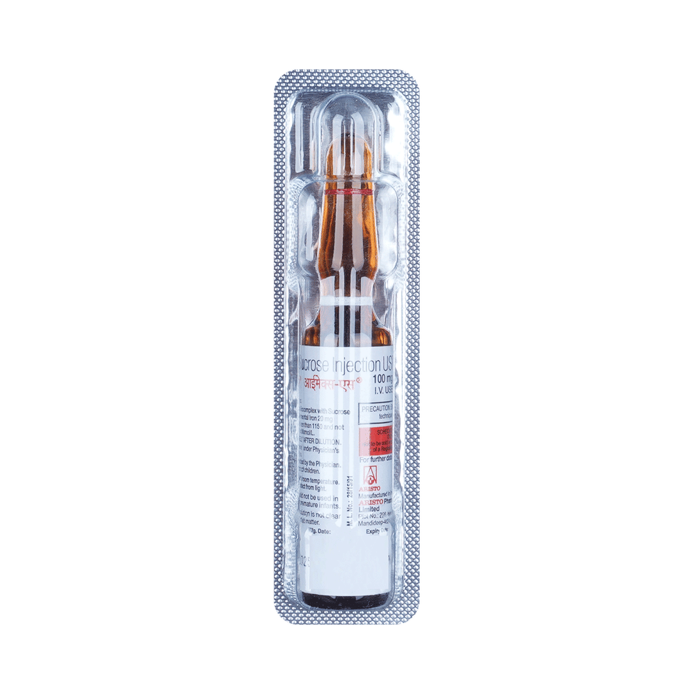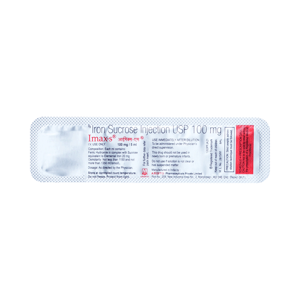 Imax-S Injection is an iron replacement medicine. It is used to treat a type of anemia where you have too few red blood cells because you have too little iron in your body (iron-deficiency anemia). Iron is needed to produce the red blood cells that carry oxygen around your body. Imax-S Injection is given by slow infusion (drip) into a vein by your doctor or nurse. Your doctor will decide the dose you need and how many injections you should have to improve your anemia. It will also help to eat a well-balanced diet that has enough iron. Good sources of iron include pulses (dal), green leafy vegetables like spinach, beans, eggs, dry fruits, and non-vegetarian foods.The most common side effects include altered taste, hypertension (high blood pressure), nausea, and injection site reactions (such as pain, redness, and swelling). Some people may develop a temporary fall in blood pressure (hypotension) if this medicine is given too rapidly. Your doctor will also monitor you for signs of an allergic reaction such as breathlessness, dizziness, feeling uneasy, hives, swelling of face, tongue, and throat, etc. while this medicine is being given. If you are bothered by them or they go on for longer, talk to your doctor or nurse.You should not have this medicine if your anemia is not caused by a lack of iron. Before taking it, tell your doctor if you have rheumatoid arthritis, asthma or other allergies, high blood pressure, or liver problems. This may affect your treatment. It is not known whether this medicine is safe for use if you are pregnant or breastfeeding so please take advice from your doctor. You will have tests to check your blood cells and iron levels, monitor your progress and check for side effects. It may be advisable to limit alcohol during treatment.