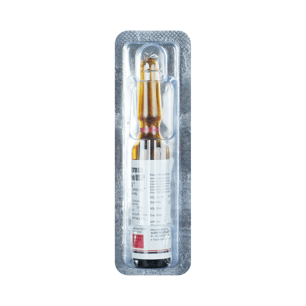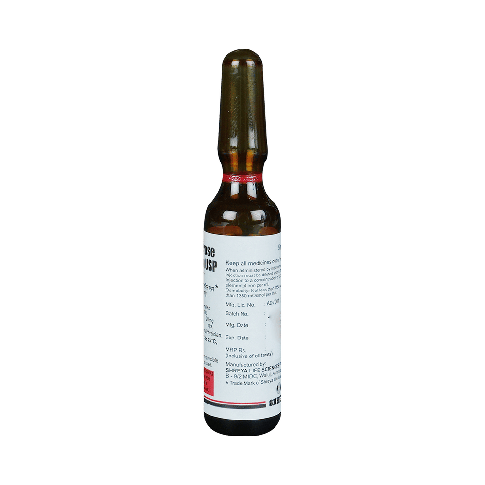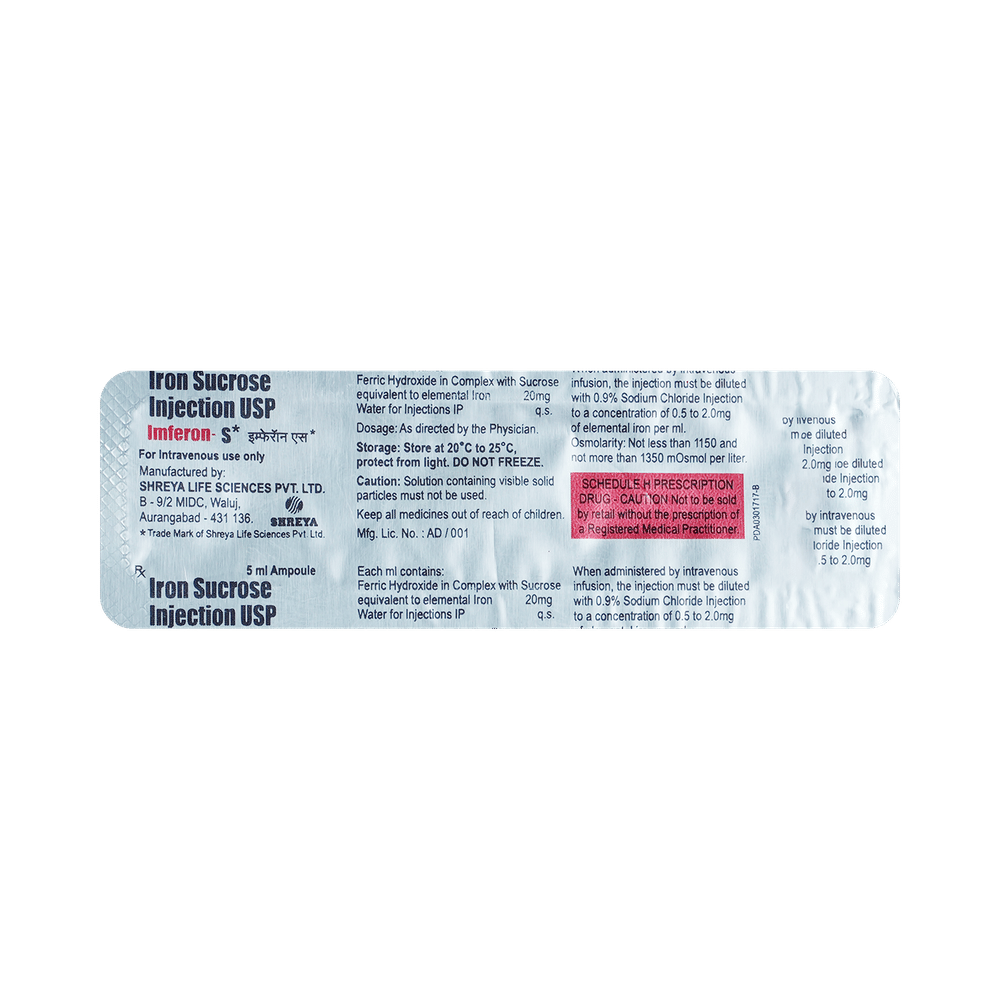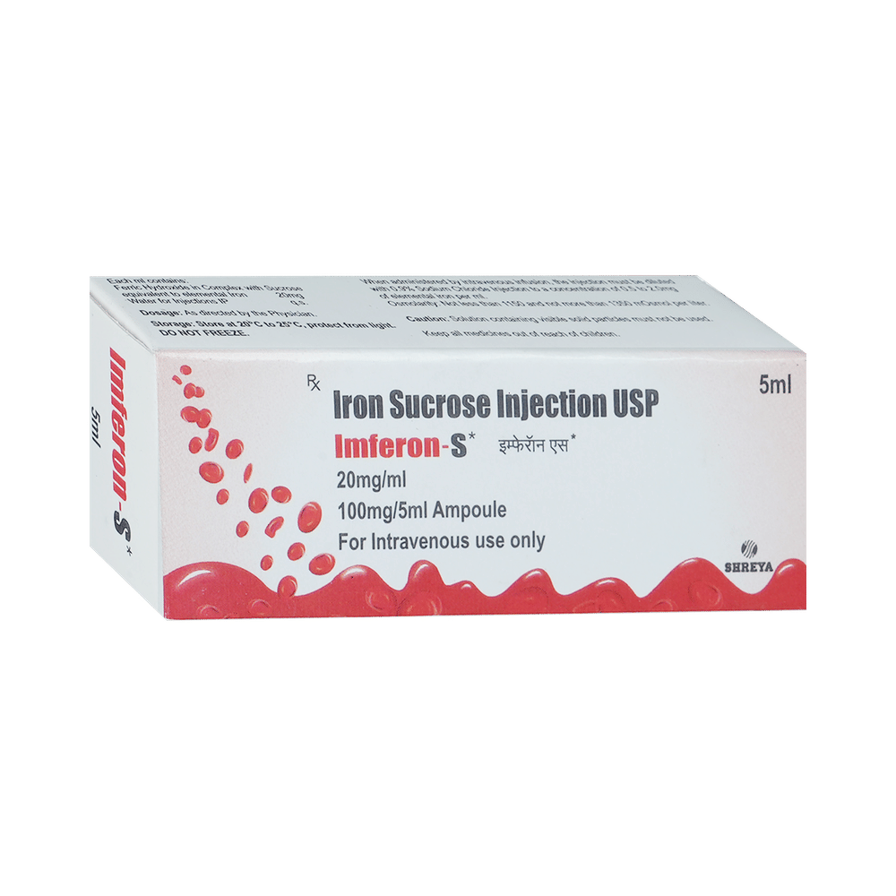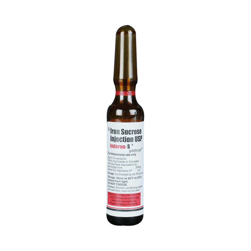 Imferon S 20mg Injection is an iron replacement medicine used to treat iron deficiency anemia, a condition where the body lacks enough healthy red blood cells due to low iron levels. It is especially useful for people who cannot take oral iron supplements or those who need quick improvement in their iron levels. Imferon S 20mg Injection is generally given by a doctor or nurse. It is important to follow your doctor's instructions carefully and attend all scheduled doses to ensure the treatment works effectively. While on treatment, eating a balanced diet that includes iron-rich foods can also support recovery. Do not stop or skip injections without medical advice, even if you start feeling better, as completing the full course helps restore and maintain healthy iron levels.Some people may experience mild side effects such as pain or swelling at the injection site, nausea, diarrhea, a metallic taste, or dizziness. These effects usually go away on their own, but if they bother you or worsen, let your doctor know. Rarely, allergic reactions like rash, itching, or difficulty breathing may occur. If you notice any serious symptoms after the injection, seek medical help immediately.Before starting Imferon S 20mg Injection, inform your doctor if you have a history of allergies, liver disease, or infections, or if you are pregnant or breastfeeding. During treatment, avoid taking other iron supplements unless your doctor tells you to, as too much iron can be harmful. Also, let your doctor know about any other medicines you are taking to prevent possible drug interactions.