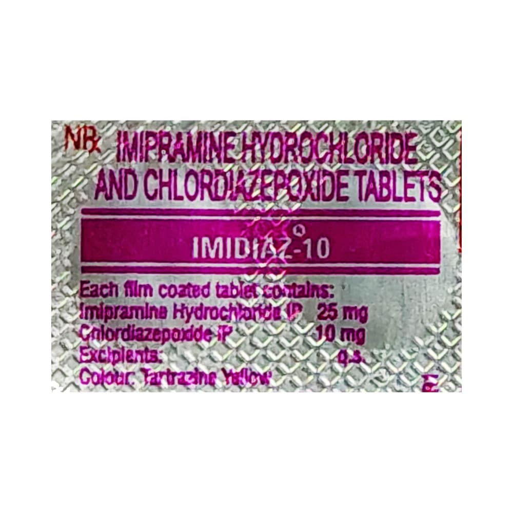 Imidiaz 10 Tablet is used in the treatment of depression. It is a combination medicine which works by increasing the level of chemical messengers in the brain that help in regulating mood. It also calms the brain by decreasing the abnormal and excessive activity of the nerve cells. Imidiaz 10 Tablet can be taken with or without food. However, it is advised to take it at the same time each day as this helps to maintain a consistent level of medicine in the body. Take this medicine in the dose and duration advised by your doctor as it has habit-forming potential. If you miss a dose of this medicine, take it as soon as you remember. Finish the full course of treatment even if you feel better. It is important not to stop this medicine suddenly as this may cause nausea and anxiety.Some common side effects of this medicine include constipation, difficulty in urination, dryness in mouth, increased heart rate and blur vision. It may also cause dizziness and sleepiness. So, do not drive or do anything that requires mental focus until you know how this medicine affects you. This medicine may cause weight gain and to control it, you should exercise regularly and have a balanced diet. Most of the common side effects tend to be mild and temporary. Your doctor may be able to suggest ways of preventing or reducing side effects if they bother you or do not go away. Serious side effects are rare.Take caution while taking medicine if you are suffering from liver or kidney disease. Your doctor should also know about all other medicines you are taking as many of these may make this medicine less effective or change the way it works. Inform your doctor if you are pregnant, planning pregnancy or breastfeeding.
