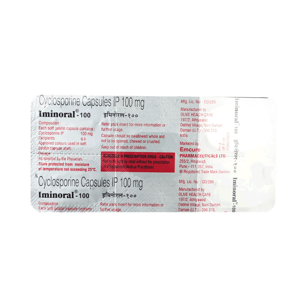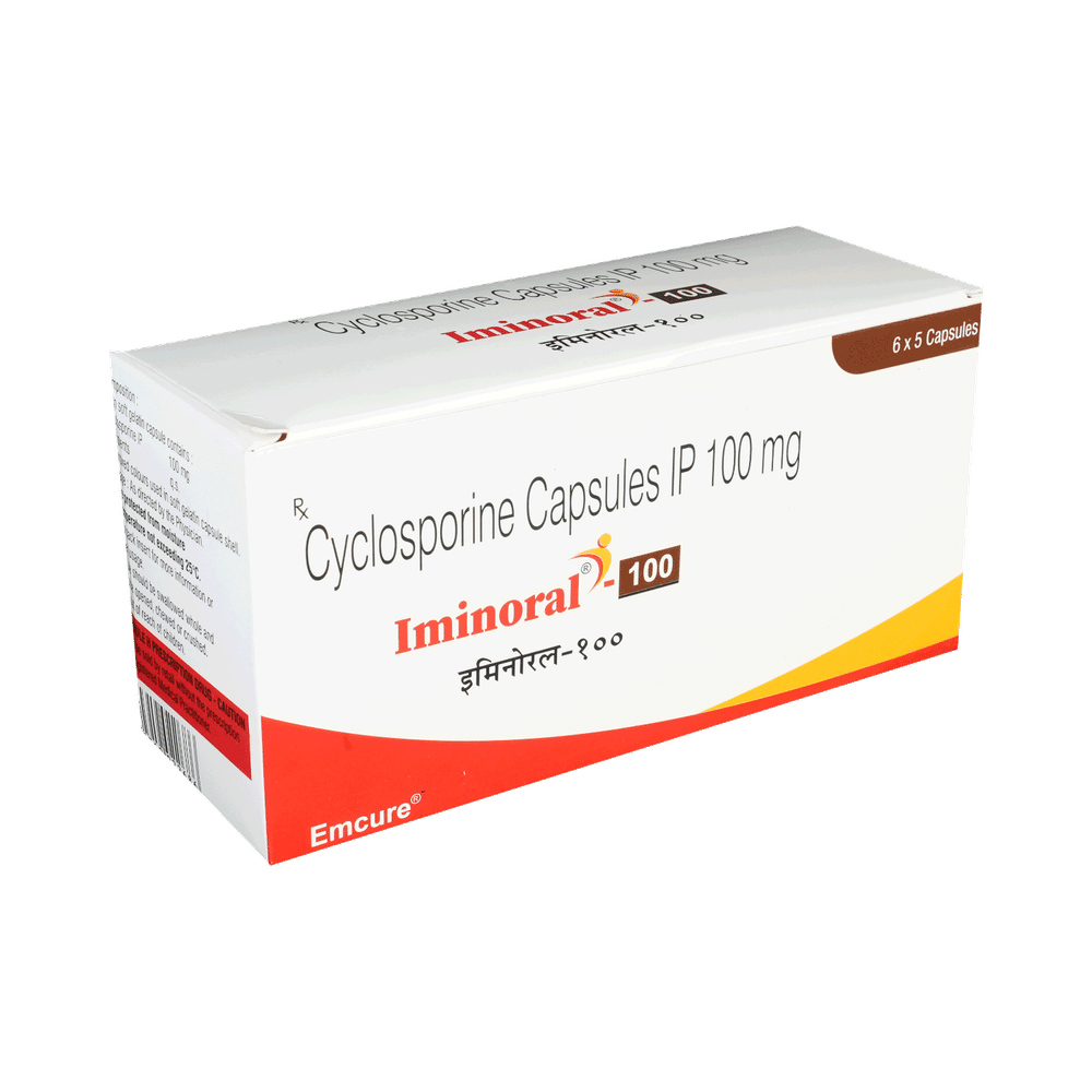 Iminoral 100 Capsule is used to prevent the body from rejecting a new organ after a liver, kidney, heart transplant, or bone marrow transplantation. It weakens the immune system so that your body does not attack the new organ. It is also used to treat nephrotic syndrome, severe rheumatoid arthritis, and psoriasis. The amount of Iminoral 100 Capsule you take depends on your weight, medical condition, and what you are being treated for. Your doctor will plan the correct dose for you. Do not change the dose without talking to your doctor. It can be taken with or without food. It is better to take it, in the same way, and at the same time every day to get the maximum benefit. Keep taking it for as long as you have been told to, even if you feel well. Stopping treatment may increase the risk of your transplanted organ being rejected.The most common side effects of this medicine include headache, unusual growth of facial or body hair, high blood pressure, diarrhea, gingival hyperplasia, and tremors. Because it lowers your immune system, you may also catch more infections than usual. Tell your doctor straight away if you develop an infection. For the same reason, you may be more at risk of developing some cancers, particularly of the skin. You should limit your exposure to sunlight.Before taking this medicine you should tell your doctor if you have liver or kidney problems, high blood pressure, gout (increased uric acid levels in the blood), or epilepsy. Also, tell your doctor about all other medicines you are taking as they may affect the working of the medicine. This medicine should only be used in pregnancy if it is clearly needed. However, it is not recommended while breastfeeding. You will have frequent medical tests while taking this medicine to check your blood pressure, liver and kidney function, and mineral levels. The results of tests may lead to changes in your dose.