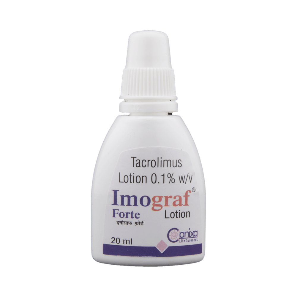 Imograf Forte Lotion is used to treat eczema (atopic dermatitis). It works by suppressing the activity of certain immune cells that cause inflammation (redness and swelling) of the skin. This relieves itching and improves rashes in atopic dermatitis. Imograf Forte Lotion is used for external use. It should be used 2-4 times a day on the affected area or use it as suggested by the doctor. It should be applied slowly and evenly to the skin until it is rubbed in. You should not use it too often and you should not cover the treated area with a bandage or plaster. You must inform your doctor if there’s no improvement even after two weeks of treatment or if the skin gets worse.Use of this medicine may cause some common side effects like erythema, headache, inflammation of hair follicle, and application site reaction like burning, irritation, itching, and redness. This medicine is not normally recommended during pregnancy or while breastfeeding unless it is clearly needed.