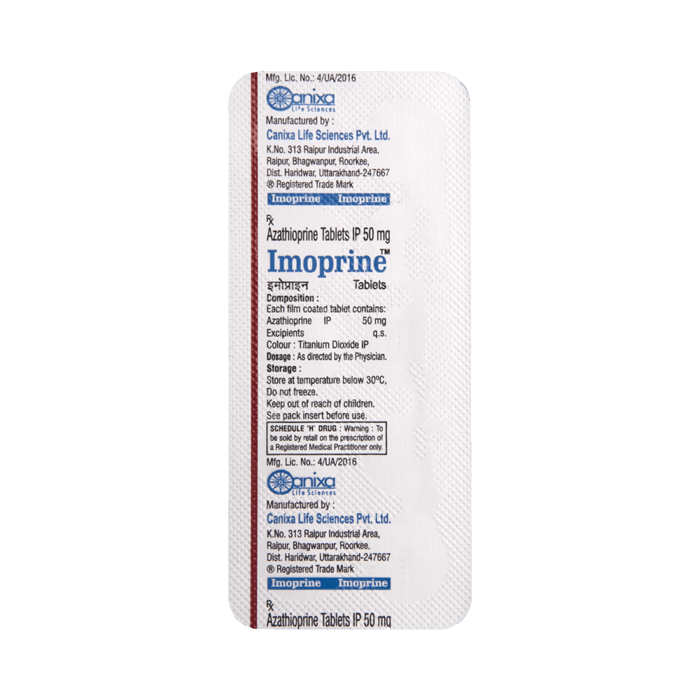 Imoprine Tablet belongs to a group of medicines called immunosuppressants. It is used with other medicines to prevent your body from rejecting an organ (such as a kidney, heart, or liver) after a transplant. It is also used in the treatment of rheumatoid arthritis. The dose of Imoprine Tablet and how often you need to take it will depend on whether you have had a transplant or are being treated for rheumatoid arthritis. Follow your doctor’s instructions on this. You can take it with or without food. Take the medicine regularly to get the most benefit and keep taking it even if you feel well. If you stop taking it, the risk of organ rejection may increase, and if you're using it for rheumatoid arthritis, your symptoms may not improve.The most common side effects of Imoprine Tablet are nausea and reduction of white blood cells and bone marrow function. Because it suppresses your immune system, you may catch infections easily. There is also an increased risk of developing some cancers for this reason. You should ask your doctor about side effects that may require urgent medical attention.Imoprine Tablet can cause birth defects and miscarriages, so do not take it if you are pregnant, planning to become pregnant, or breastfeeding. You should talk to your doctor before taking this medicine if you have any signs of infection or any unexpected bruising or bleeding. Let your doctor also know what other medications you are taking, as some may interact with this medicine and affect the way it works. You will have regular tests to check for any changes in the number of your blood cells.