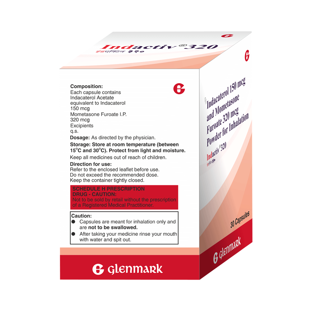 Indactiv 320 Capsule is a combination of two medicines. It relieves the symptoms of uncontrolled asthma in adults and children aged above 12 years. It relieves inflammation (swelling) and relaxes the muscles in the airways, thereby making breathing easier. Your doctor will tell you how often you need to use this medicine. The effect of this medicine may be noticeable after a few days but will only reach its maximum after a few weeks. This medicine must be used regularly to be effective, so go on taking it even if you don't have any symptoms. That means it’s doing its job. If you stop taking it your symptoms may get worse. This medicine should not be used to relieve sudden shortness of breath. If sudden shortness of breath occurs, use your rescue inhaler. To get the benefit from this medicine you need to make sure you get your inhaler technique right, otherwise, it does not work as well.The most common side effects include difficulty breathing or swallowing, swelling of the tongue, lips, or face, skin rash, itching, and hives. You can prevent some of these symptoms by rinsing your mouth and throat with water or brushing your teeth after using your inhaler.Before taking it, you should tell your doctor if you have any kidney or liver diseases so that your doctor can prescribe a suitable dose for you. You should also tell your doctor if you are pregnant, planning pregnancy or breastfeeding.