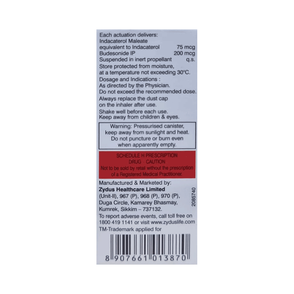 Indanide 200 Inhaler CFC Free is a combination of two medications. Indacaterol works by relaxing and opening air passages in the lungs. Budesonide works by decreasing inflammation (swelling) in the airways, making it easier to breathe.