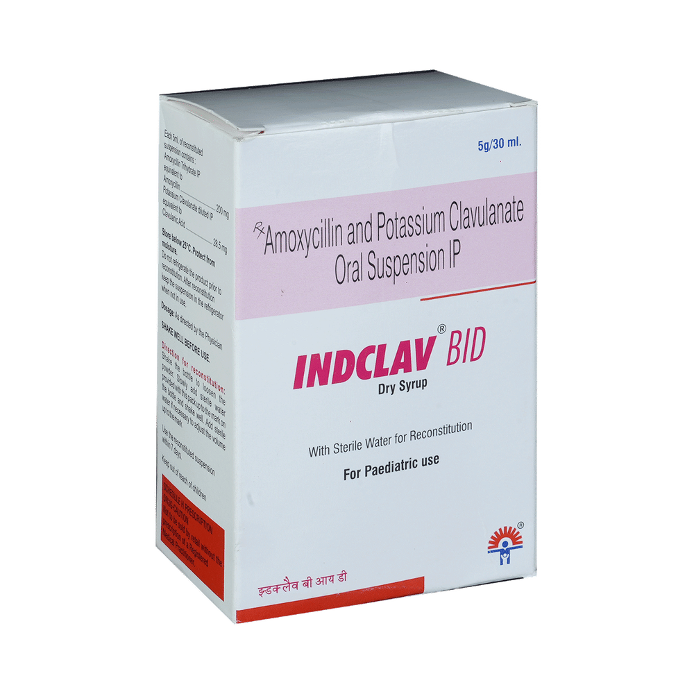Indclav Bid 228 Dry Syrup is an antibiotic medicine that helps treat bacterial infections of the ear, nose, throat, chest, lungs, teeth, skin, and urinary tract. It is capable of killing bacteria that have become resistant to other therapies and thus also helps treat tuberculosis that is resistant to other treatments. You can give Indclav Bid 228 Dry Syrup to your child with or without food. It is better to give it with food as that helps increase absorption and decrease the risk of stomach upset. The doctor may prescribe giving it two to three times a day. Medicine dose depends on the severity of the infection, its type, and your child’s body weight and age. So, stick to the dose, time, and way prescribed. If your child vomits the medicine within 30 minutes of intake, let the child calm down and repeat the dose. Do not double dose if it's the time for the next dose.Indclav Bid 228 Dry Syrup may cause vomiting, diarrhea, nausea, abdominal pain, and allergy. These side effects should diminish on their own. But, in case they persist or start bothering your child, you must not delay speaking to your child’s doctor.Share your child’s entire medical history with the doctor, including any previous episode of allergy, heart problem, a blood disorder, birth defects, airway obstruction, lung anomaly, gastrointestinal problem, skin disorder, liver impairment, and kidney malfunction. This information will assist the doctor in making dose alterations and in planning your child’s overall treatment.