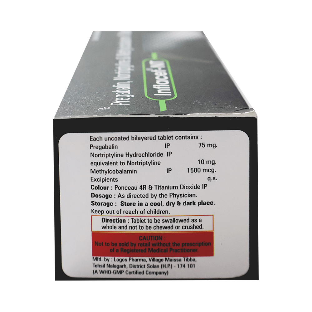 Inflacet-NT Tablet is a combination of three medicines: Pregabalin, Nortriptyline and Methylcobalamin. Pregabalin is an alpha 2 delta ligand which decreases pain by modulating calcium channel activity of the nerve cells. Nortriptyline is a tricyclic antidepressant which increases the levels of chemical messengers (serotonin and noradrenaline) that stop the movement of pain signals in the brain. Methylcobalamin is a form of vitamin B which helps in the production of myelin, a substance that protects nerve fibers and rejuvenates damaged nerve cells. Together, they relieve neuropathic pain (pain from damaged nerves).