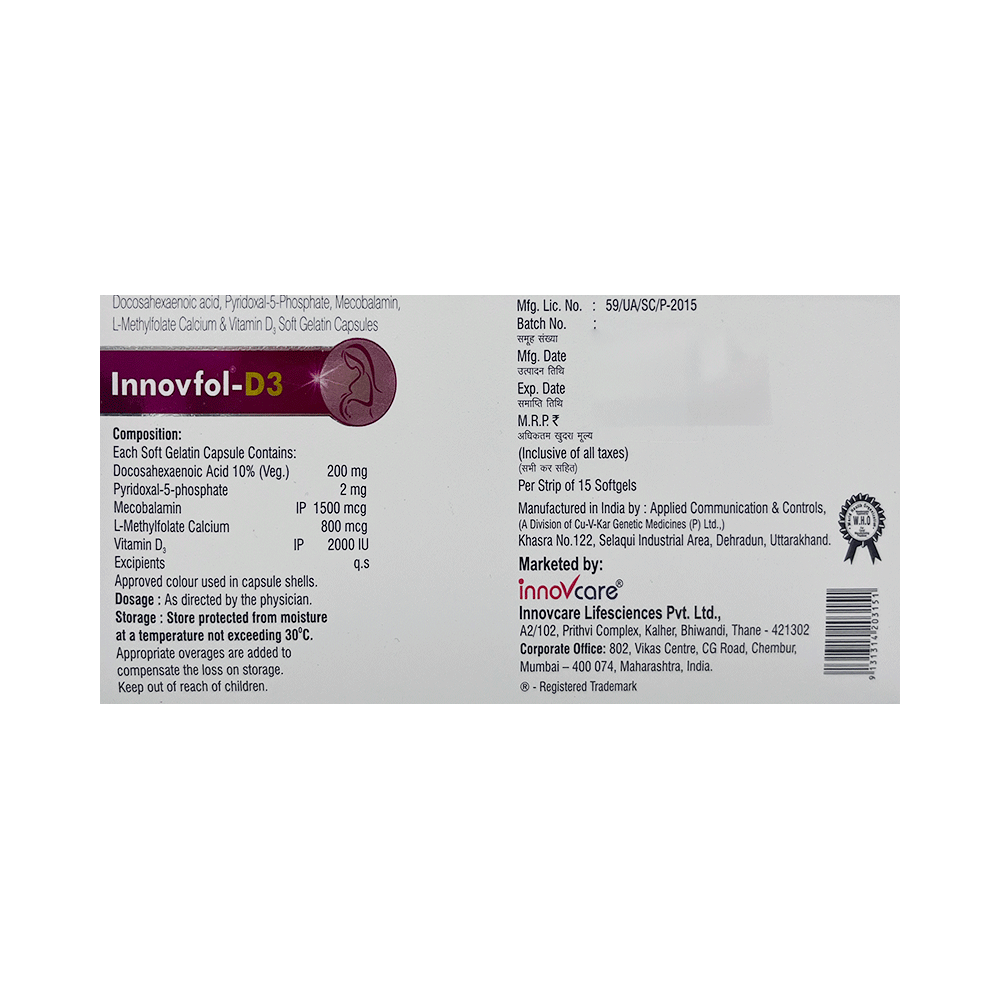 Innovfol-D3 Capsule is a combination of five medicines : L-Methyl Folate, Methylcobalamin, Pyridoxal-5-phosphate, Vitamin D3, and Docosahexanoic acid (DHA). L-methylfolate is the primary biologically active isomer of folic acid and the primary form of folate in circulation. Folic Acid is a form of vitamin B. It plays a vital role in the formation of red blood cells, which carry oxygen throughout the body. It is also essential in pregnancy due to its role in the development of the unborn baby's brain and spinal cord. Methylcobalamin is a form of vitamin B12 that restores its level in the body thereby helping in treating certain anemias and nerve problems. Pyridoxal-5-phosphate is a nutritional supplement that provides essential nutrients to our body and improves overall health. Vitamin D3 is a form of vitamin D. It raises vitamin D levels in your blood. This in turn raises calcium levels in your blood by helping you absorb more calcium from food. Docosahexaenoic acid (DHA) belongs to the class of medications called nutritional supplements. DHA plays a vital role in brain development. DHA decreases cholesterol and triglyceride levels, inhibits platelet aggregation and oxidation of LDL, decreases the synthesis of inflammatory markers such as prostaglandins. Overall, DHA plays a vital role in reducing the heart and circulatory disease risks.