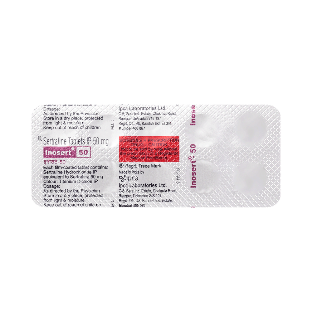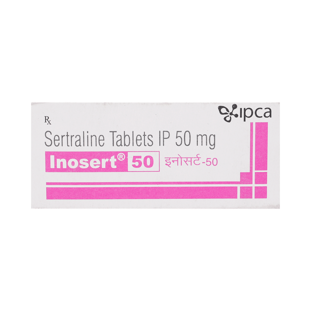 Inosert 50 Tablet is a medicine that is used to treat major depressive disorder (MDD) and obsessive-compulsive disorder (OCD). It works by increasing the levels of serotonin, a natural chemical in the brain that plays an important role in mood, emotions, and behavior. Inosert 50 Tablet should be taken exactly as prescribed by your doctor. It can be taken with or without food, but it is best to take it at the same time each day to help you remember. Treatment for depression and OCD often takes several weeks before you start to feel the full benefit, so it is important to keep taking the medicine regularly and not stop suddenly, even if you feel better.Stopping the medicine too quickly may cause withdrawal symptoms or make your condition return. For the best results, combine the treatment with healthy habits such as regular sleep, exercise, and support from family, friends, or counseling if recommended.Some common side effects of Inosert 50 Tablet include nausea, indigestion, loss of appetite, increased sweating, tremors, insomnia (difficulty in sleeping), and diarrhea. Sexual side effects like decreased sexual drive, delayed ejaculation, and erectile dysfunction may also be seen. Let your doctor know straight away if you develop any sudden worsening of mood or any thoughts about harming yourself.Before taking this medicine, you should tell your doctor if you have epilepsy (seizure disorder or fits), diabetes, liver or kidney disease, heart problems, or glaucoma. These may affect your treatment. Pregnant or breastfeeding women should also consult their doctor before taking it. Some other medicines may affect the way it works, especially other antidepressants and medicines called MAO inhibitors. Inform your doctor about all the medicines you are taking to make sure you are safe.