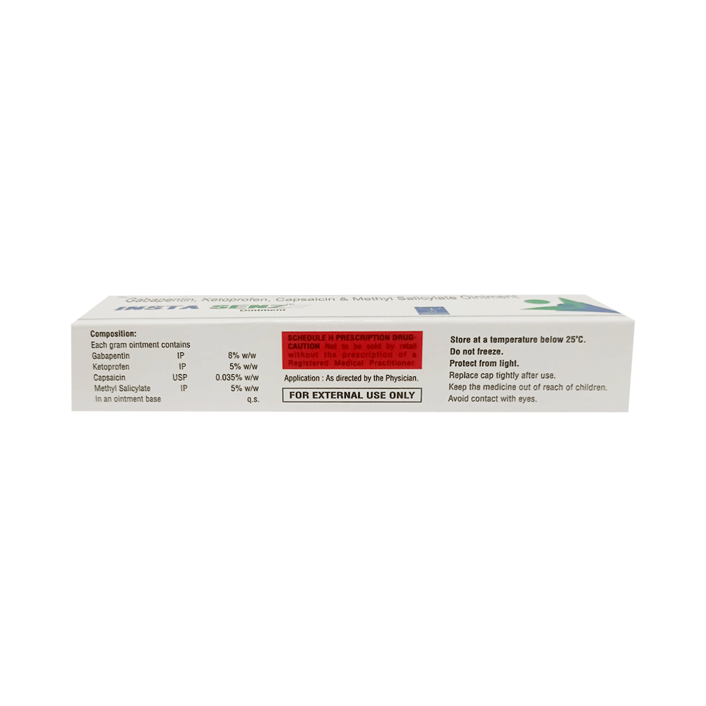 Insta Senz Ointment is a combination of four medicines: Gabapentin, Capsaicin, Ketoprofen, and Methyl Salicylate. Gabapentin is an alpha 2 delta ligand which decreases pain by modulating calcium channel activity of the nerve cells. Capsaicin is a plant derivative which activates certain receptors to cause prolonged desensitization of the local pain nerves. Ketoprofen is a non-steroidal anti-inflammatory drugs (NSAIDs). It works by blocking the release of certain chemical messengers that cause pain and inflammation (redness and swelling). Methyl Salicylate is used as topical analgesic (pain reliever). It works by first cooling the skin then warming it up. This cooling and warming up action interferes with the pain signal transmission through nerves.Together, they relieve neuropathic pain (pain from damaged nerves).