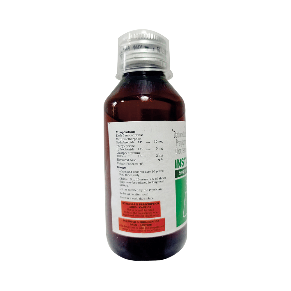In Treatment of Dry coughA dry cough, also known as non-productive cough, is a cough where no phlegm or mucus is produced. This is irritating, usually associated with a tickly throat and may be caused due to cold, flu, allergies or throat irritants. Instaryl D Syrup suppresses dry, hacking coughs. It will also relieve allergy symptoms like watery eyes, sneezing, runny nose or throat irritation and help you carry out your daily activities more easily. This medicine can provide a quick relief and the effects can last up to several hours.In Common coldInstaryl D Syrup effectively relieves symptoms associated with common cold, such as a blocked nose, runny nose, watery eyes, sneezing, and congestion or stuffiness. It helps loosen thick mucus, making it easier to cough out. It also shrinks the blood vessels and provides rapid relief that lasts for several hours. These actions make breathing easier. Instaryl D Syrup usually starts working within a few minutes, and the effects can last up to several hours.show moreshow less