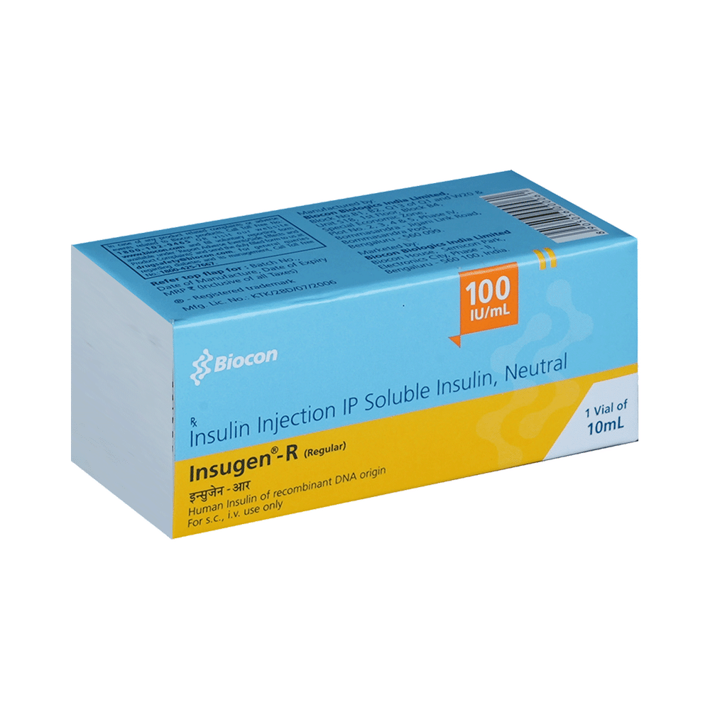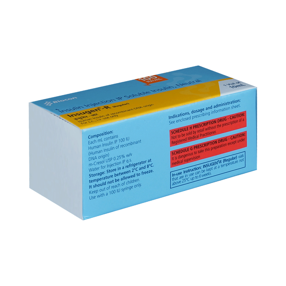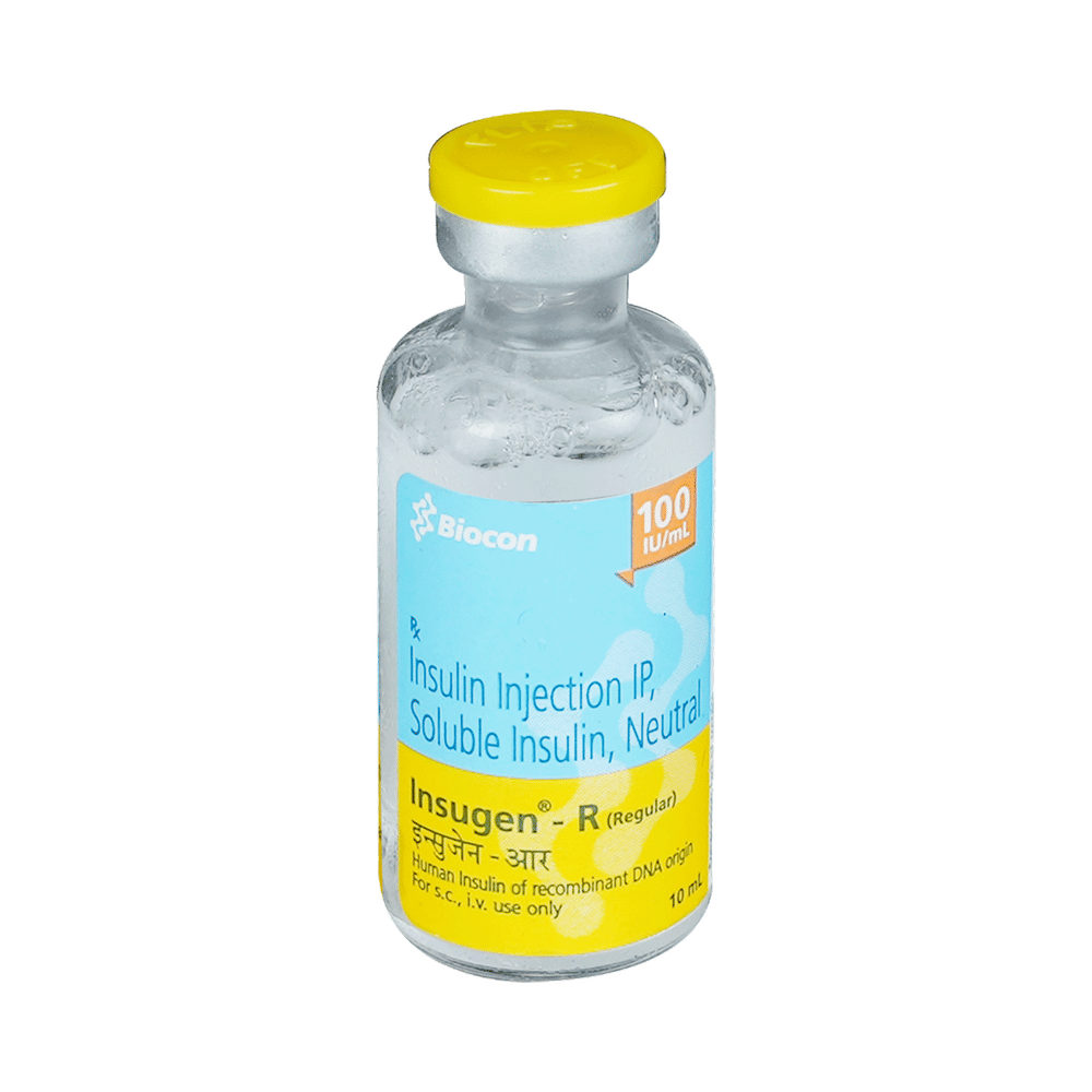 Insugen-R 100IU/ml Solution for Injection is a short-acting insulin used to treat type 1 and type 2 diabetes mellitus. It is used together with a healthy diet and regular exercise to control blood sugar levels after meals. This helps to prevent serious complications of diabetes like kidney damage and blindness. Insugen-R 100IU/ml Solution for Injection is normally prescribed along with a long-acting type of insulin or other diabetes medicines. Your doctor or nurse will teach you the correct way of injecting it under the skin. It should be taken 20-30 minutes before a meal. Do not stop taking it unless your doctor tells you to. It is only a part of the treatment program that should also include a healthy diet, regular exercise, and weight reduction as advised by your doctor. Check your blood sugar levels regularly, keep track of your results and share them with your doctor. This is very important to work out the correct dose of the medicine for you. The most common side effect of this medicine include low blood sugar levels (hypoglycemia), injection site reactions, cold sweats, anxiety, shakiness, hunger, rapid heartbeat, headache, and nervousness. It may be seen if you do not eat right after a dose of this fast-acting insulin. To prevent this, it is important to always inject only the correct dose of medicine, have regular meals, and monitor your blood sugar levels regularly. Drinking excessive alcohol can also lead to a fall in your blood sugar levels. Other side effects include reactions at the injection site like redness or swelling. Some people gain weight while taking insulin. Do not use this medicine when you have low blood sugar levels (hypoglycemia). Tell your doctor if you have ever had kidney, liver, or heart problems before starting treatment. Pregnant or breastfeeding women should also consult their doctor as the dose may need to be changed.