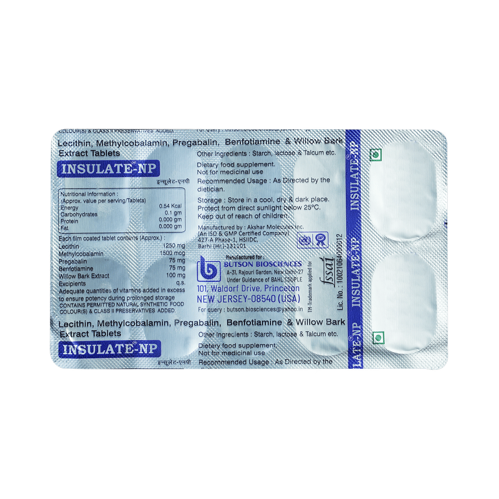 Insulate-NP Tablet is a combination of four medicines: Lecithin, Methylcobalamin, Pregabalin and Biotin. Lecithin and Biotin provides essential nutrients. Methylcobalamin/Mecobalamin is a form of vitamin B which helps in the production of myelin, a substance that protects nerve fibers and rejuvenates damaged nerve cells. Pregabalin is an alpha 2 delta ligand which decreases the pain by modulating calcium channel activity of the nerve cells.