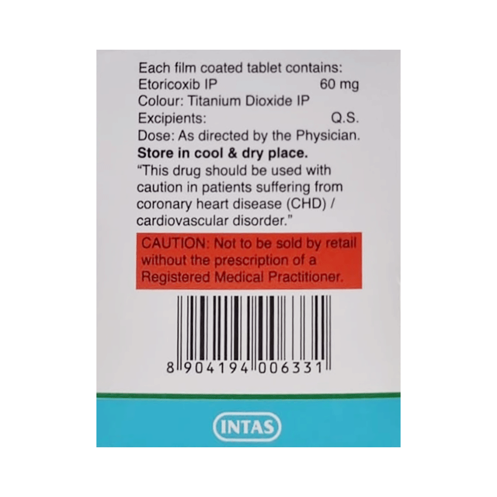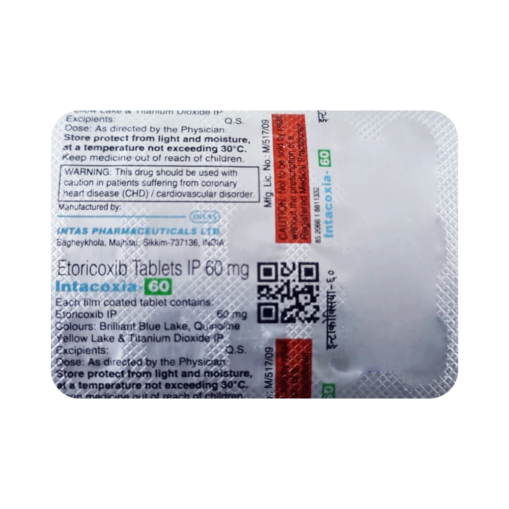 Intacoxia 60 Tablet is a pain-relieving medicine. It is used for relieving moderate pain and swelling of joints associated with different forms of gout and arthritis. It is also used for short-term treatment of moderate pain after dental surgery. Intacoxia 60 Tablet can be taken with or without food. The dose depends on what you are taking it for and how well it helps your symptoms. You should take it as advised by your doctor. Do not take more or use it for longer than recommended.The most common side effects of this medicine include stomach pain, heartburn, nausea, edema, dizziness, headache, and discoloration of the skin. These are not usually serious, but if you are worried, ask your doctor about ways of reducing or preventing them.Before taking it, you should let your doctor know if you have a history of ulcers or bleeding in your stomach, high blood pressure, or any trouble with your heart, kidneys, or liver. Let your doctor also know about all the other medicines you are taking because they may affect, or be affected by, this medicine. Pregnant or breastfeeding women should consult their doctor before starting treatment.