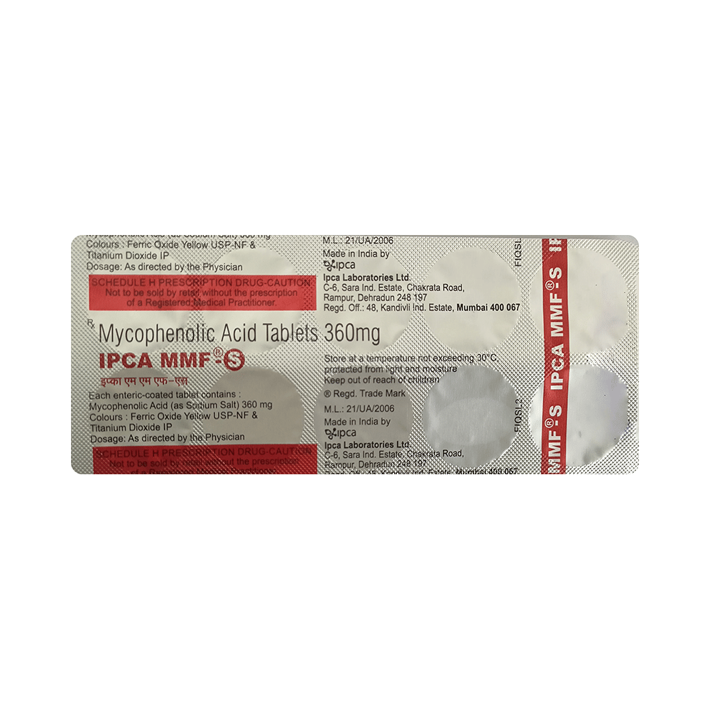 In Prevention of organ rejection in transplant patientsIpca MMF-S Tablet belongs to a group of medicines known as immunosuppressive agents. It lowers your immune response and reduces the chance of your body attacking the transplanted organ. Organ rejection happens when your immune system treats the new organ as an invader and attacks it. This medicine may be used in combination with other medicines to suppress the immune system and help your body accept the new organ.