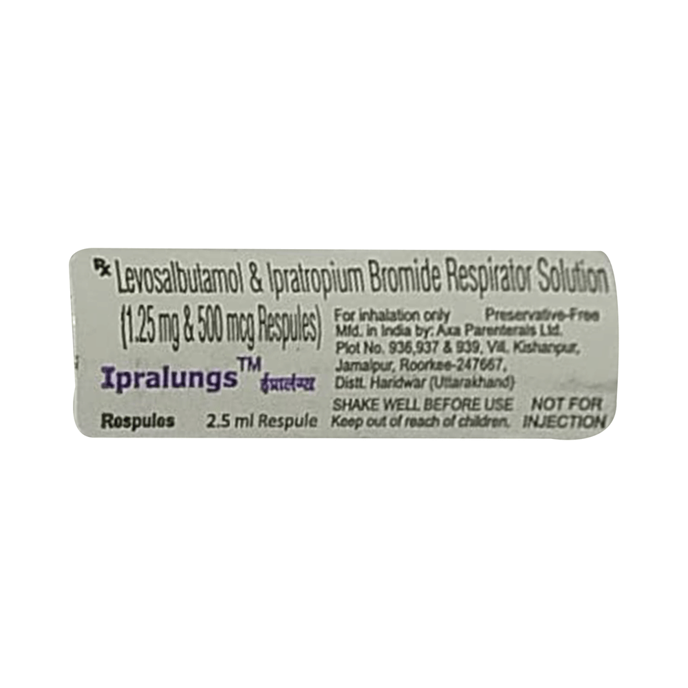 Ipralungs 1.25mg Respules is a belongs to a group of medicines called fast-acting bronchodilators or relievers. It is used to treat the symptoms of asthma and chronic obstructive pulmonary disease (COPD) such as coughing, wheezing, and feeling short of breath. Ipralungs 1.25mg Respules gives quick relief from breathing problems when you need it. In most cases, you will be given another inhaler to prevent your symptoms (a preventer) to u with this. This medicine works quickly and the effects can last several hours. You can take it at any time of day, but only use it when you notice symptoms, such as coughing, wheezing, shortness of breath, and tightness in the chest or you know that you are going to do an activity that can make you breathless. When an asthma attack happens, you should take the number of puffs your doctor recommends. There are several types of inhaler devices so make sure you know how to use your inhaler correctly, otherwise, it may not work. Do not stop using this medicine unless your doctor tells you to. If you stop, your breathing problems could get worse.Common side effects of this medicine include accidental injury, bronchitis, dizziness, pain, pharyngitis, nasal congestion, vomiting, tremors, palpitations, chest pain, and sore throat. These side effects are not often dangerous and they should gradually improve as your body gets used to this medicine. There are other, rarer, side effects and you should call your doctor straight away if you get chest pain, a very bad headache, or very bad dizziness.Before using Ipralungs 1.25mg Respules, you should tell your doctor if you have high blood pressure, an overactive thyroid gland, a history of heart problems, diabetes, or low levels of potassium in your blood to make sure it is safe. Also, make sure your doctor knows if you are pregnant or breastfeeding before taking this medicine. Because this medicine can make you feel dizzy or shaky, do not drive, cycle, or use tools or machinery until you feel better. You should not smoke as it causes damage to your lungs and will make your condition worse.