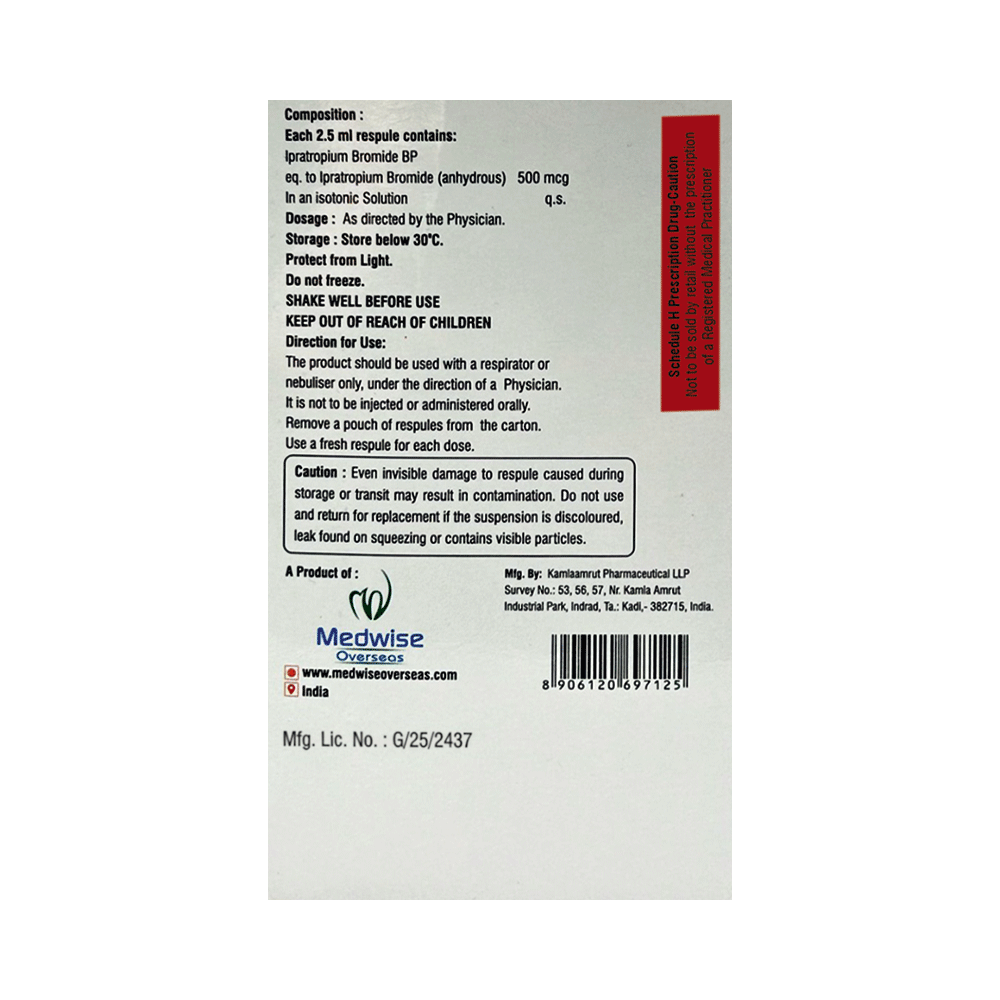 Ipramed Respule (2.5ml Each) is an anticholinergic medicine. It is used in the treatment of chronic obstructive pulmonary disease and asthma. It relaxes the muscles of your airways and eases symptoms such as chest tightness, shortness of breath, wheezing, and coughing Ipramed Respule (2.5ml Each) is only for the inhalational purpose, use it in the dose and duration as prescribed by your doctor. The dose and how often you take it depends on what you are taking it for. Your doctor will decide how much you need to improve your symptoms. You should take this medicine for as long as it is prescribed for you. It does not prevent the already started breathing trouble or asthma attack, hence always carry your medical inhaler with you for an emergency.The most common side effects of this medicine include headache, dizziness, throat irritation, cough, dry mouth, and nausea. If these bother you or appear serious, let your doctor know. There may be ways of reducing or preventing them. To overcome dry mouth, it is advised to increase water intake, carry sugar candy or maintain good oral hygiene.Before taking this medicine, let your doctor know if you have liver or kidney disease, or if you are pregnant or breastfeeding. Your doctor should also know about all other medicines you are taking as many of these may make this medicine less effective or change the way it works. If you experience dizziness or blurred vision, then avoid driving or attention-seeking activity.