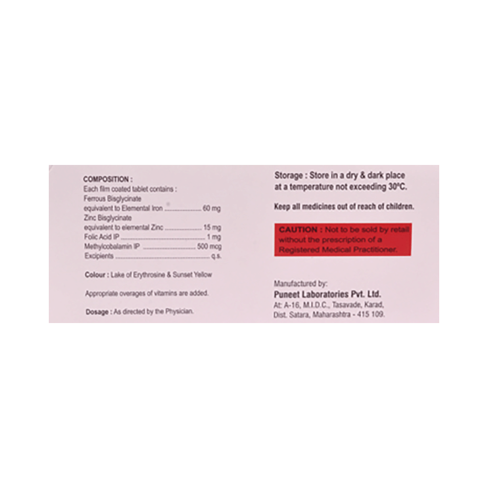 Salt Composition: Iron (60mg) + Zinc (15mg) + Folic Acid (1mg) + Vitamin B12 (500mcg)