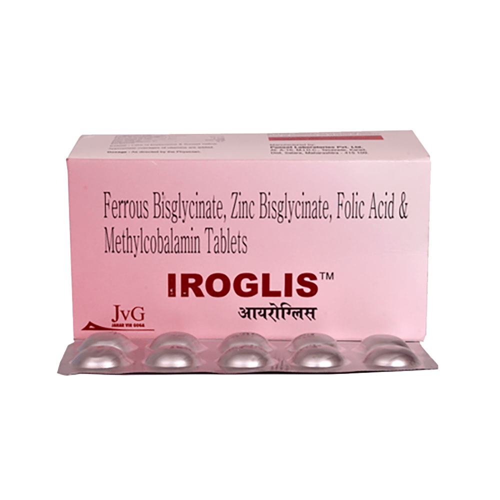 Iroglis Tablet is a combination of vitamins and mineral supplements prescribed to treat vitamin, folate, and other nutritional deficiencies. It ensures the proper growth and functioning of the body and strengthens immunity. It also treats and prevent different forms of anemia. Iroglis Tablet is taken orally with or without food. It should be used in the dose and duration prescribed by your doctor. It is advised to take this medicine at a fixed time to avoid missing a dose.This medicine should not be taken more than the recommended dose. It is usually a safe medicine with very minimal or no side effects. However, some people may experience symptoms like nausea and constipation. Consult your doctor if such symptoms do not resolve on their own or get worse.Before taking this medicine, tell your doctor if you have any other health conditions. Inform your doctor if you are taking any other medicines or if you are pregnant or breastfeeding. It is advised not to take alcohol after taking this medicine.