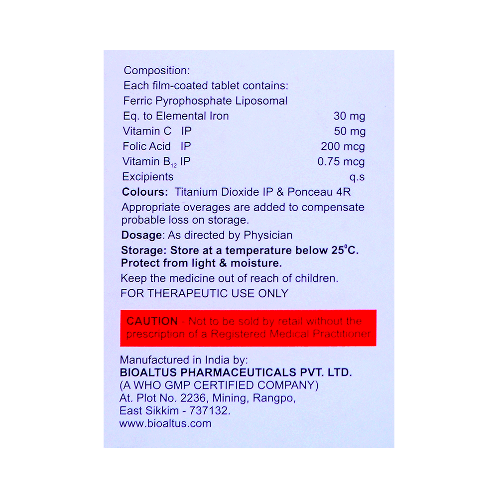 Salt Composition: Folic Acid (200mcg) + Iron (30mg) + Vitamin C (50mg) + Vitamin B12 (0.75mcg)