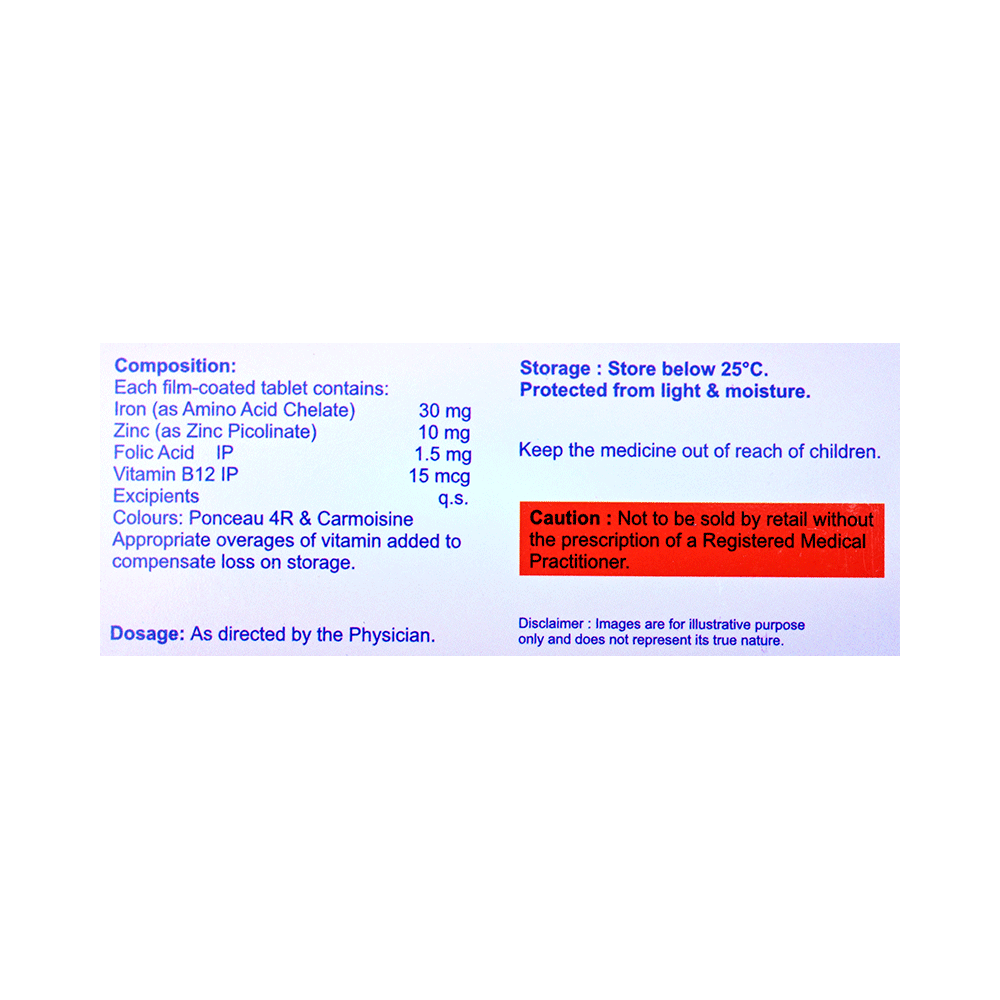 Salt Composition: Iron (30mg) + Zinc (10mg) + Folic Acid (1.5mg) + Vitamin B12 (15mcg)