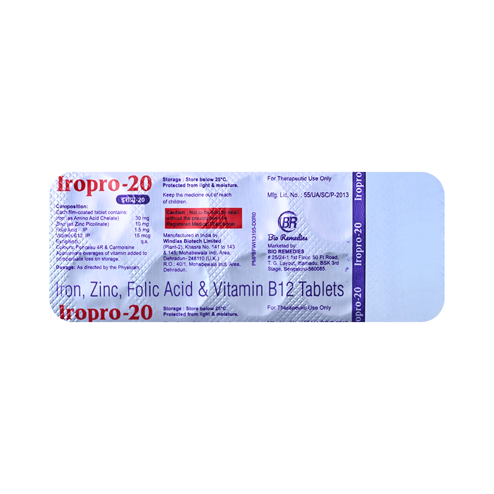 Iropro 20 Tablet is a combination of vitamins and mineral supplements prescribed to treat vitamin, folate, and other nutritional deficiencies. It ensures the proper growth and functioning of the body and strengthens immunity. It also treats and prevent different forms of anemia. Iropro 20 Tablet is taken orally with or without food. It should be used in the dose and duration prescribed by your doctor. It is advised to take this medicine at a fixed time to avoid missing a dose.This medicine should not be taken more than the recommended dose. It is usually a safe medicine with very minimal or no side effects. However, some people may experience symptoms like nausea and constipation. Consult your doctor if such symptoms do not resolve on their own or get worse.Before taking this medicine, tell your doctor if you have any other health conditions. Inform your doctor if you are taking any other medicines or if you are pregnant or breastfeeding. It is advised not to take alcohol after taking this medicine.