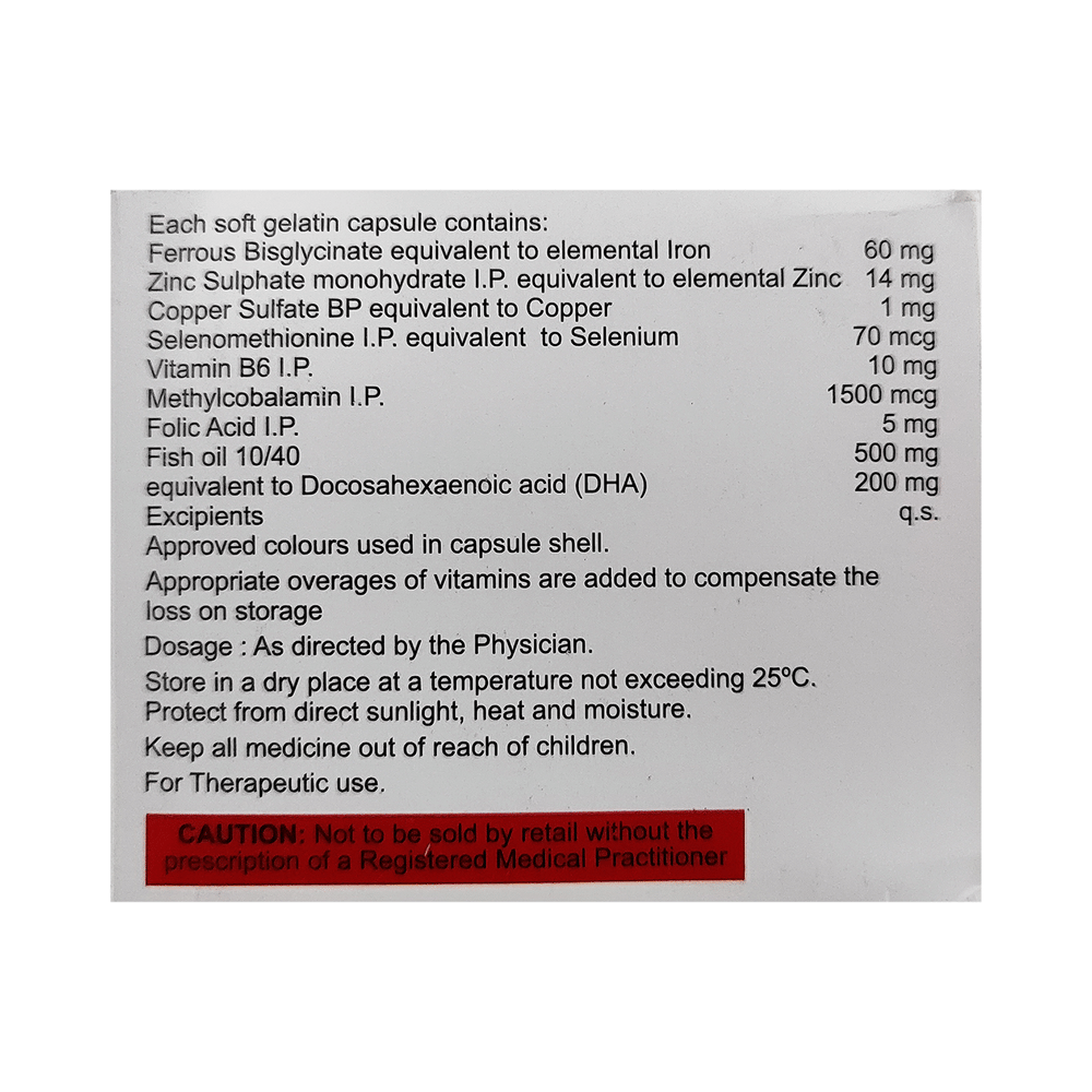 Salt Composition: Iron (60mg) + Zinc (14mg) + Copper (1mg) + Selenium (70mcg) + Vitamin B6 (Pyridoxine) (10mg) + Methylcobalamin (1500mcg) + Folic Acid (5mg) + Fish Oil (500mg) + Docosahexanoic Acid (200mg)