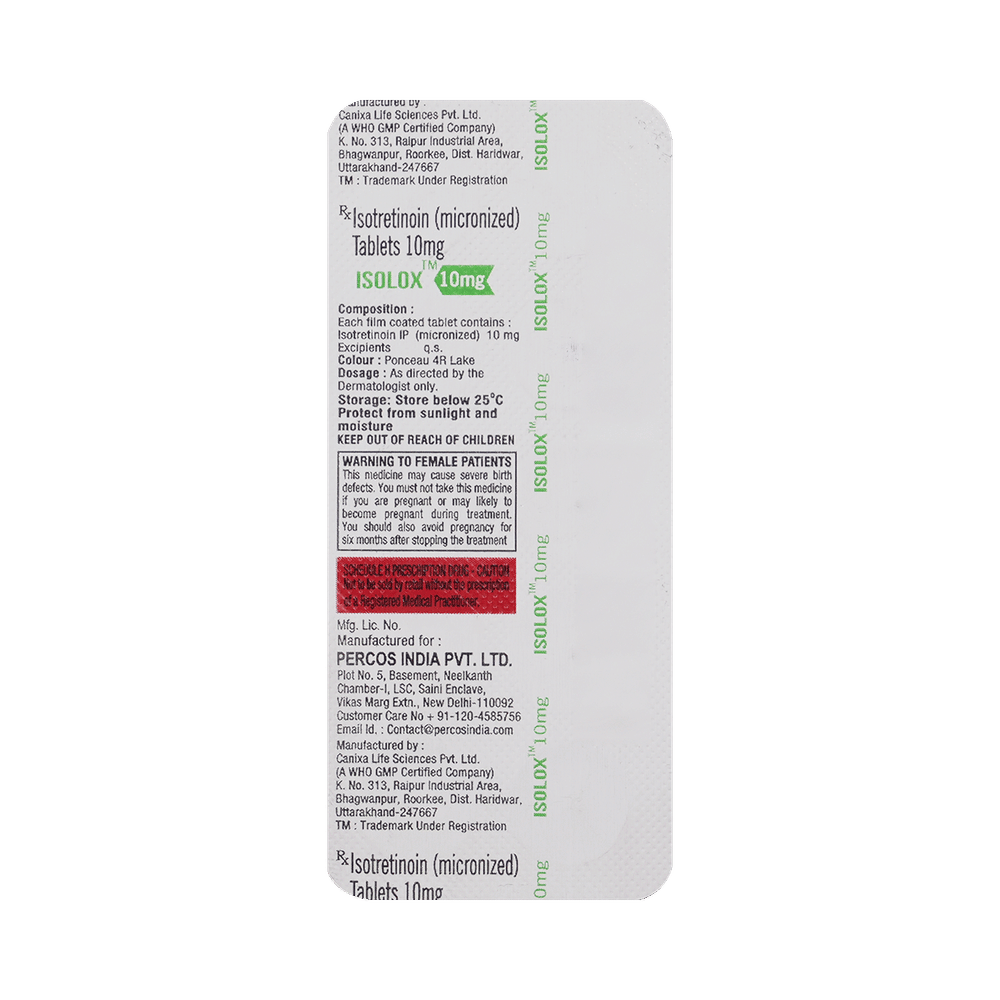 Isolox 10mg Tablet is a derivative of vitamin A. It acts on glands (sebaceous) to reduce the production of a natural substance (sebum) that causes acne. Also, the controlled sebum production kills acne-causing bacteria. It also works as an anti-inflammatory to decrease inflammation (redness and swelling).