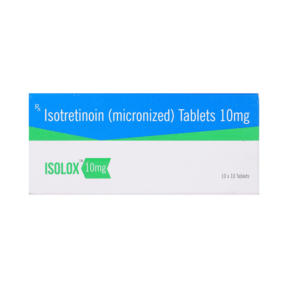 Isolox 10mg Tablet belongs to a group of medicines called retinoids (vitamin A derivative). It is used to treat severe acne that has not responded to other treatments. Isolox 10mg Tablet should be used in the dose and duration as advised by your doctor. Take it with food, preferably at the same time each day to avoid a missed dose. It may take several weeks for your symptoms to improve but keep taking the medicine regularly to get the most benefit. If you notice no improvement after a few weeks, see your doctor again.The most common side effects include dry skin, rash, and increased liver enzymes. They are not usually serious and often disappear after getting used to the medicine but if they bother you or do not go away, tell your doctor.Isolox 10mg Tablet may make you more sensitive to sunlight so you should limit your exposure to the sun. It may also make your skin more fragile. Avoid any waxing (hair removal), or laser treatments during treatment. Additionally, it may cause dryness of the mouth, lips, and eyes so drink plenty of water and use a moisturizer. This medicine may lead to birth defects, do consult your doctor if you are pregnant or planning pregnancy.