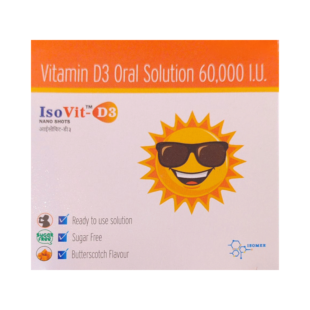 IsoVit-D3 Nano Shots (5ml Each) Butterscotch Sugar Free is used in the treatment of vitamin D deficiency and osteoporosis. It helps the body to absorb calcium. Calcium is essential for maintaining strong and healthy bones. It is used when your diet does not provide enough calcium. IsoVit-D3 Nano Shots (5ml Each) Butterscotch Sugar Free should be taken as directed by your doctor. It is best taken with or after food, as this helps your body absorb it, and you should take it regularly to get the most benefits. If you are using it to treat osteoporosis, you will also be prescribed other medicines. This medicine may be only part of a complete treatment program that includes making changes to your diet and taking calcium and vitamin supplements. Learn about the foods you should eat to ensure you get enough calcium and vitamin D.IsoVit-D3 Nano Shots (5ml Each) Butterscotch Sugar Free has few side effects, and none are common. If you take too much, you may feel weakness, muscle pain, or a metallic taste in your mouth. If you experience any such side effects, speak with your doctor. They may be able to help you reduce or treat the symptoms.Before taking this medicine, tell your doctor if you have high calcium levels in your blood or if you have any heart, kidney, or liver disease. Some other medicines can decrease the absorption of vitamin D3, so let your doctor know about all the other medicines you are taking to make sure you are safe. This medicine may help during pregnancy when your body needs more vitamin D, but too much could harm your baby. Discuss it with your doctor.