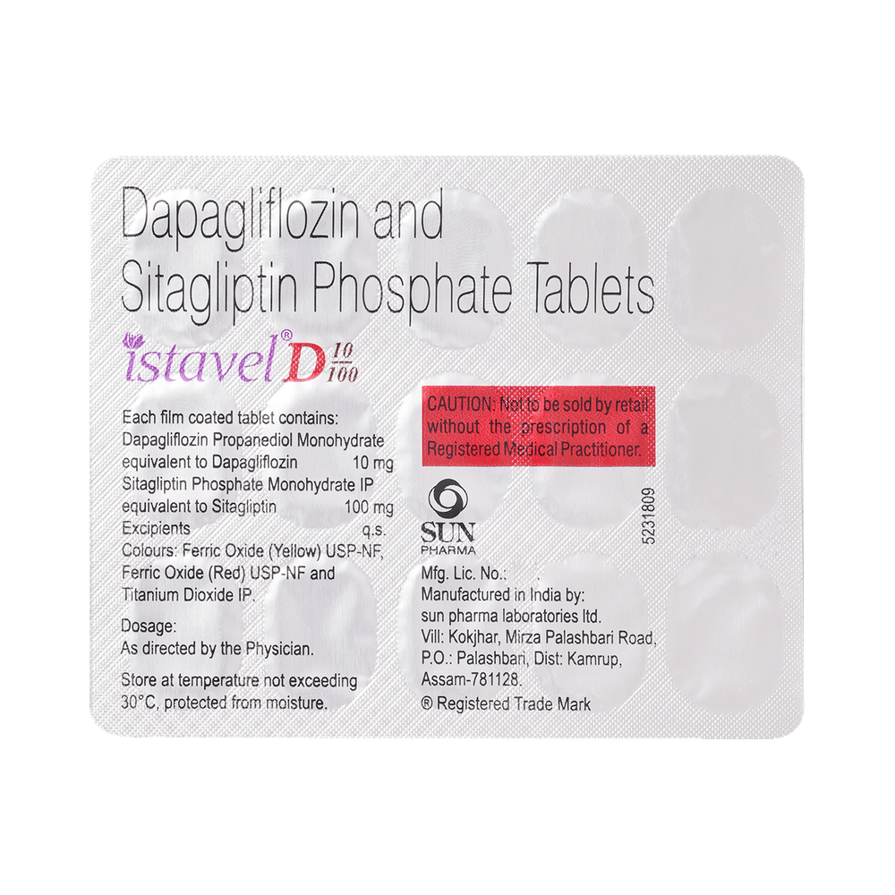 Istavel D 10/100 Tablet is a combination of two antidiabetic medications. Dapagliflozin increases urinary glucose excretion and reduces blood glucose levels. Sitagliptin reduces the amount of glucose produced by the liver by raising insulin levels and decreasing the levels of glucagon (the hormone that increases blood glucose level).