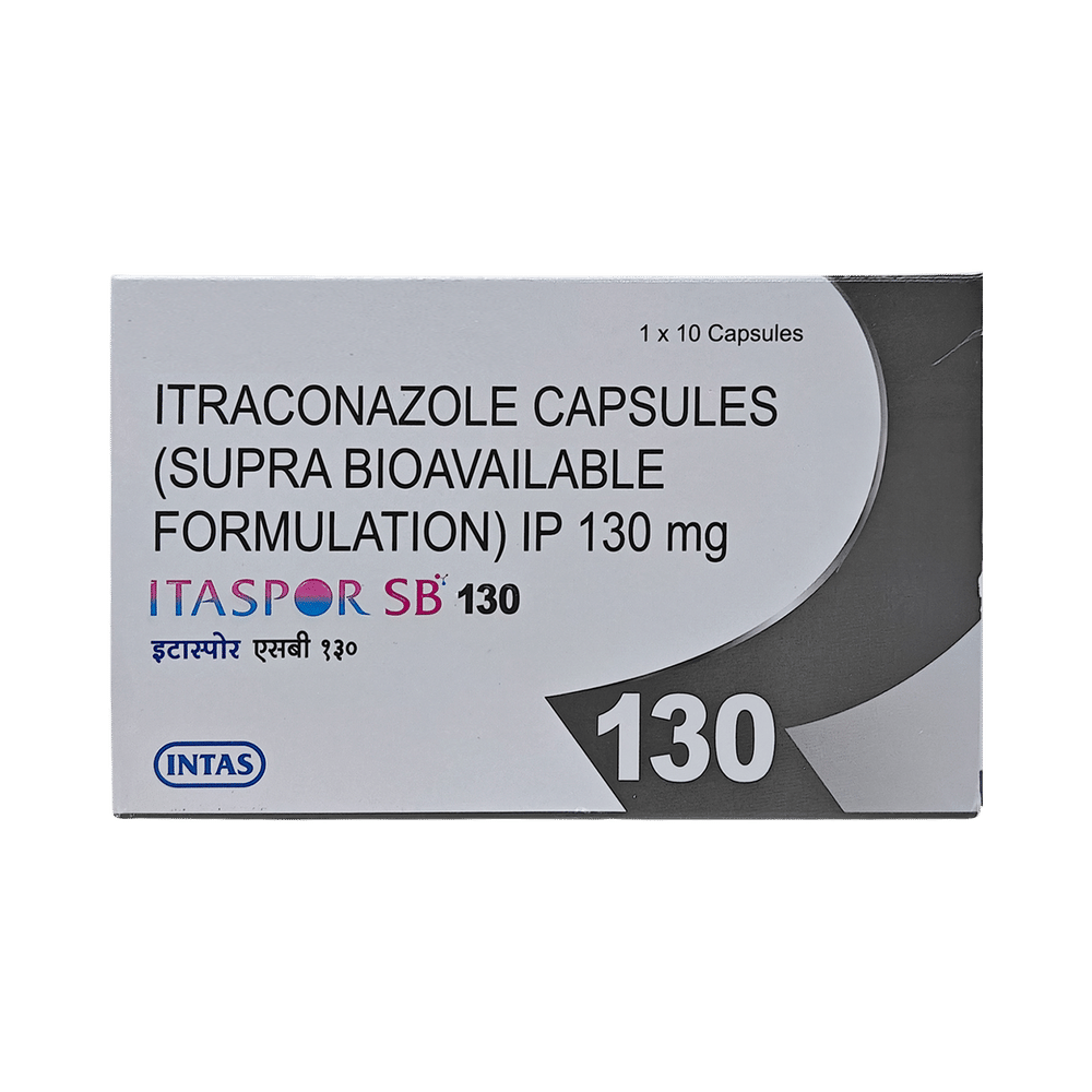 In Treatment of Fungal infectionsItaspor-SB 130mg Capsule is an antifungal medicine. It is used to treat infections in different parts of the body caused by fungi. It works by killing and stopping the growth of fungi. This provides relief from various symptoms caused by the infection and speeds up the healing process. You should keep taking the medicine until you complete the dose even if you get better. This will prevent the infection from returning.