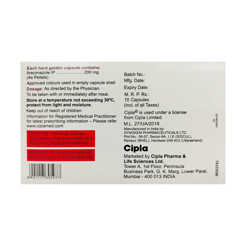 In Treatment of Fungal infectionsItracip 200 Capsule is an antifungal medicine. It is used to treat infections in different parts of the body caused by fungi. It works by killing and stopping the growth of fungi. This provides relief from various symptoms caused by the infection and speeds up the healing process. You should keep taking the medicine until you complete the dose even if you get better. This will prevent the infection from returning.