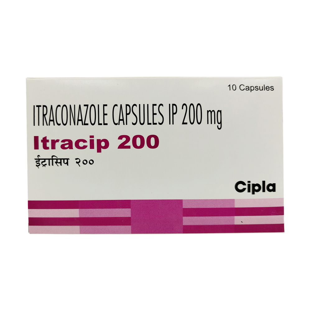 Itracip 200 Capsule belongs to a group of medicines called antifungals. It works by stopping the growth of fungi and is used to treat infections of the mouth, throat, vagina, and other parts of the body including fingernails and toenails. It kills fungi by destroying the fungal cell membrane. Itracip 200 Capsule should be taken in the dose and duration as prescribed by your doctor. It should be swallowed whole and can be taken with food. To get the most benefit, take this medicine at evenly spaced times and continue using it until your prescription is finished, even if your symptoms disappear after a few days. If you stop the treatment too early, the infection may return and if you miss doses you can increase your risk of infections that are resistant to further treatment. Tell your doctor if the infection does not get better or if it gets worse.The most common side effects of this medicine include nausea, dizziness, headache, vomiting, diarrhea, abdominal pain, constipation, and dyspepsia. You could ask your doctor about ways of preventing or reducing these effects. Get emergency medical help if you have signs of an allergic reaction like severe skin rash, tingling, difficulty breathing, swelling of your face, lips, tongue, or throat. Do not take it if you are pregnant or could become pregnant unless your doctor has told you to. Talk to your doctor before taking this medicine if you have a history of heart failure, a weak immune system (including HIV/AIDS), kidney problems, or liver problems such as yellow skin (jaundice). This medicine may not be suitable for you. If your course of treatment is for more than a month, your doctor may want to check your liver by testing your blood.