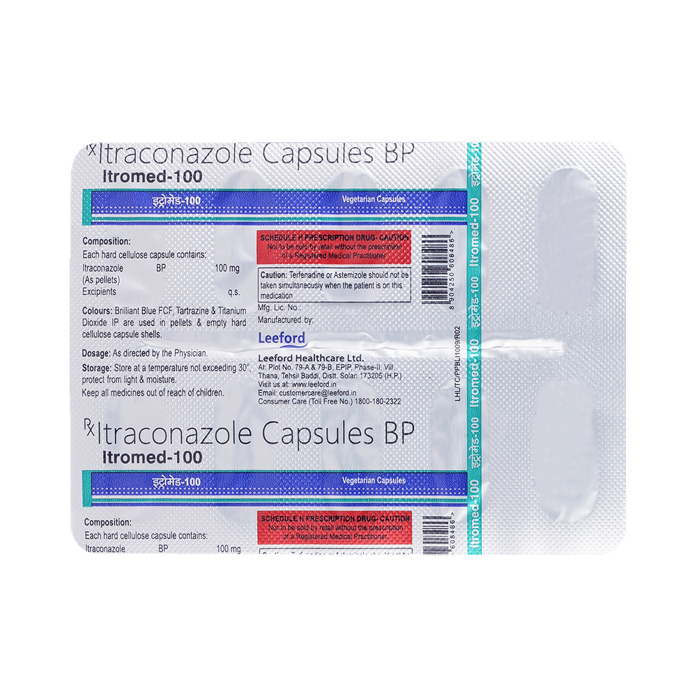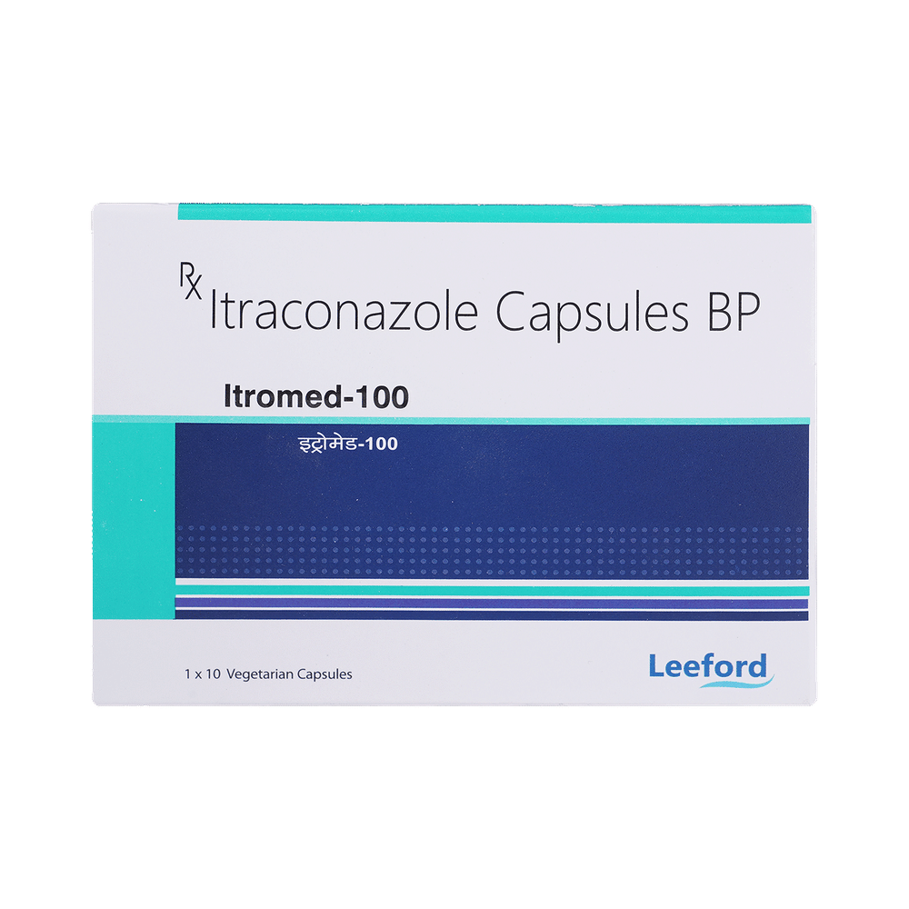 In Treatment of Fungal infectionsItromed 100mg Capsule is an antifungal medicine. It is used to treat infections in different parts of the body caused by fungi. It works by killing and stopping the growth of fungi. This provides relief from various symptoms caused by the infection and speeds up the healing process. You should keep taking the medicine until you complete the dose even if you get better. This will prevent the infection from returning.