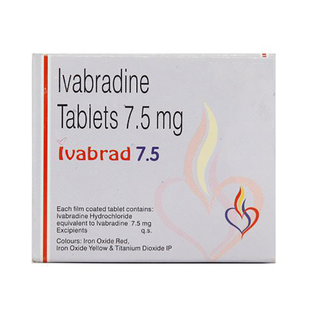 Ivabrad 7.5 Tablet is a medicine used for the treatment of angina (heart-related chest pain) and chronic (long-term) heart failure. It makes the heart work more efficiently by lowering the heart rate. This relieves chest pain and decreases the risk of hospitalization in heart failure patients. The dose will depend on what you are being treated for. Since the treatment for angina or heart failure is usually lifelong, you should not stop using it without talking to your doctor. It should be taken with food at the same time each day. If you take too much in one go, your heart could slow down too much and make you feel breathless or tired. If this happens, call a doctor.The most common side effects are temporary brightness/flashes in your vision, slow heart rate, high blood pressure, atrial fibrillation, dizziness, blurred vision, and ECG changes. Some side effects, such as fainting and significant changes to your heartbeat, may be very serious and may need urgent medical attention. Avoid driving until you know how this medicine will affect you.Do not use Ivabrad 7.5 Tablet if you have severe liver disease, a low resting heart rate, or a heart rhythm disorder. This medicine is also not suitable if you have very low blood pressure and heart failure that has recently become worse. This medicine interacts with certain other medicines used to treat high blood pressure, fungal infections, and HIV. Do not take it if you are pregnant, trying to become pregnant, or breastfeeding.
