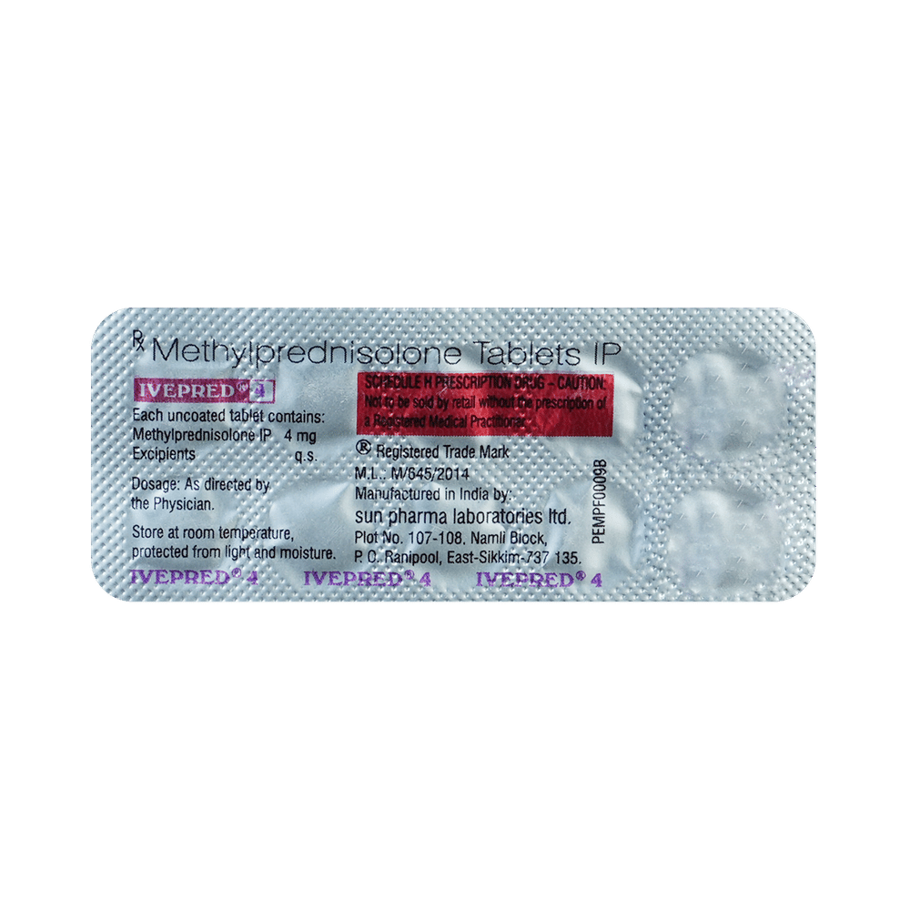 In Treatment of Allergic conditionsIvepred 4 Tablet is used to treat different inflammatory and allergic conditions including arthritis, lupus, psoriasis, ulcerative colitis which affect the skin, blood, eyes, lungs, stomach, and nervous system. It works by lowering your immune system’s response to these conditions thereby reducing symptoms such as swelling, pain, itching and other allergic-type reactions.This medicine is given orally (by mouth). You should always take it as it has been prescribed for you. Do not stop taking it without your doctor’s advice. This can cause unpleasant withdrawal symptoms. Because this medicine weakens your immune system, you should avoid being near people who are ill or have infections.In Treatment of Systemic lupus erythematosus (SLE)Systemic lupus erythematosus (SLE) is an autoimmune disease. In this disease, the immune system of the body mistakenly attacks healthy tissue. It can affect the skin, joints, kidneys, brain, and other organs. Ivepred 4 Tablet prevents the release of substances in the body that cause inflammation. It lowers your immune system’s response and reduces symptoms such as swelling, pain, itching and other allergic-type reactions.In Treatment of Skin disordersIvepred 4 Tablet prevents the release of substances in the body that cause inflammation. It can be used to treat different inflammatory and allergic conditions of the skin such as eczema and psoriasis. It works by lowering your immune system’s response to these conditions thereby relieving symptoms such as swelling, pain, itching and other allergic-type reactions.In Treatment of Eye disordersIvepred 4 Tablet helps relieve symptoms of eye infections such as redness, swelling, itching and watering of eyes. This medicine works by decreasing the production of certain chemicals that cause inflammation of the eyes. This will make it easier for you to go about your daily activities. Use it as prescribed to get the most benefit. If you see no improvement even after a week, talk to your doctor.In Treatment of Rheumatic disorderRheumatic disorder is an autoimmune condition where your body’s immune system (which usually fights bacteria and viruses) attacks your body’s own cells. Ivepred 4 Tablet stops that from happening and can relieve the symptoms of this condition such as pain, swelling, and stiffness in your joints. It can also slow down joint damage, reduce disability, and enable you to be as active for as long as possible. It can take several weeks or months to notice the effect of the medicine. You should continue taking it until your doctor says it is okay to stop using the medicine.show moreshow less