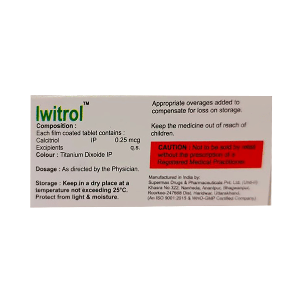 Iwitrol Tablet is used to treat and prevent low levels of calcium and bone disease in patients whose kidneys or parathyroid glands (glands in the neck that release natural substances to control the amount of calcium in the blood) are not working normally. Calcitriol (a vitamin D analogs) works by helping the body to use more of the calcium found in foods or supplements and regulating the body's production of parathyroid hormone.