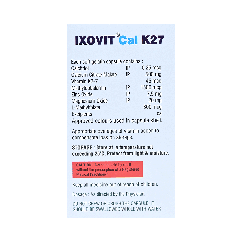 Ixovit Cal K27 Softgel Capsule is a combination of medicines that is used to treat nutritional deficiencies. It helps in proper growth and development of cells, bone and improves heart health. It also helps in protein synthesis and production of blood cells like red blood cells or white blood cells and boosts immunity. Ixovit Cal K27 Softgel Capsule may be taken with or without food. It should be used in the dose and duration as prescribed by your doctor. It is advised to take this medicine at a fixed time.This medicine should not be taken more than the recommended dose. It is usually a safe medicine with very minimal or no side effects. However, if you experience severe diarrhea, vomiting, or constipation, you should consult your doctor without delay.Before taking this medicine, tell your doctor if you have any other health conditions. Inform your doctor if you are taking any other medicines or if you are pregnant or breastfeeding.