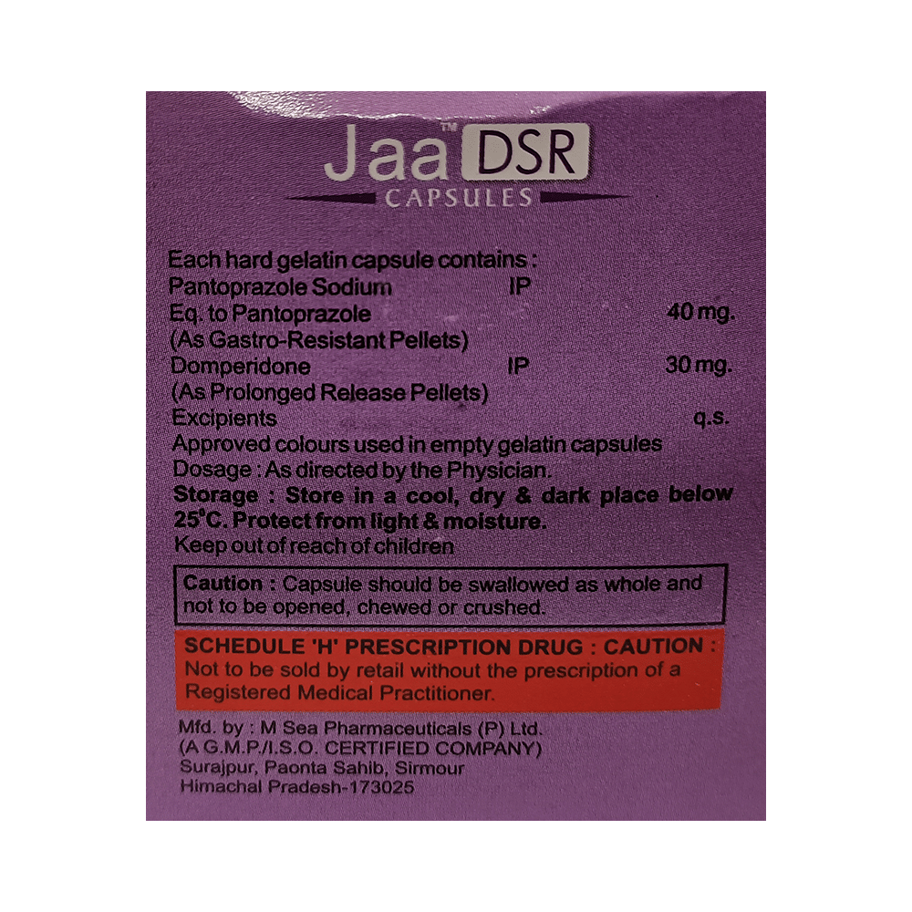 Jaa DSR Capsule is a medicine that is used to treat conditions like acid reflux disease (GERD), erosive esophagitis, gastritis, gastric and duodenal ulcers, and indigestion with symptoms like heartburn, bloating, and regurgitation. It works by lowering acid production and helping the stomach empty faster. Take Jaa DSR Capsule exactly as prescribed by your doctor, usually once daily before breakfast. Swallow it whole with water; do not crush or chew. To get the best results, maintain a healthy diet, avoid late-night meals, caffeine, spicy or oily foods, and stop smoking or alcohol use. Do not skip doses or stop early, even if you feel better, as that may lead to a return of the symptoms.The most common side effect of Jaa DSR Capsule is dry mouth. It may also cause headache, dizziness, diarrhea, nausea, or mild stomach discomfort in some people. These are usually temporary. If you experience persistent vomiting, irregular heartbeat, rash, or severe diarrhea, contact your doctor immediately. Staying hydrated and taking the medicine before meals may help reduce stomach-related side effects.Inform your doctor about any liver, kidney, or heart problems before starting Jaa DSR Capsule. Avoid taking it with other drugs that may affect heart rhythm or interact with domperidone or pantoprazole. Do not use it if you have a history of gastrointestinal bleeding or obstruction, or if you are allergic to any of the ingredients in the medicine. Pregnant or breastfeeding women should consult their doctor before use.
