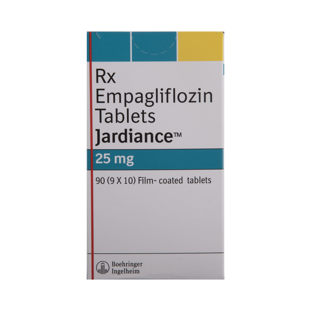 Jardiance 25mg Tablet is used to treat type 2 diabetes, heart failure, and chronic kidney disease (CKD). It helps lower blood sugar levels in people with diabetes when used with diet and exercise. In heart failure and CKD, it helps reduce hospitalizations and slow disease progression. Jardiance 25mg Tablet can be taken with or without food, in the dose and duration prescribed by your doctor. For best results, continue to follow your doctor’s advice on diet and exercise. Stay well-hydrated, especially during hot weather or physical activity, and attend regular check-ups to monitor your blood sugar, kidney function, and overall health.The most common side effects of Jardiance 25mg Tablet are urinary tract infections and female genital yeast infections (vaginal mycosis). Maintain good personal hygiene, drink plenty of fluids, and contact your doctor if these symptoms persist or worsen. Some people, especially those taking insulin or sulfonylureas, may experience low blood sugar (hypoglycemia). If this happens, consume something sugary and inform your doctor if it occurs frequently.Do not use Jardiance 25mg Tablet if you are allergic to empagliflozin or any of its ingredients. This medicine is not recommended for people with type 1 diabetes. Use it with caution if you have kidney or liver problems, are elderly, take diuretics (water pills), or have low blood pressure, as it may cause dehydration or dizziness. Women who are pregnant or breastfeeding should not use Jardiance 25mg Tablet, as it may harm the baby.