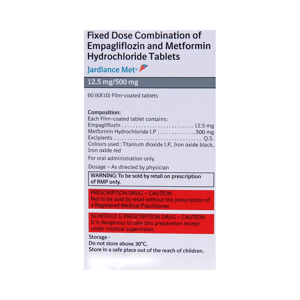 Jardiance Met 12.5mg/500mg Tablet is a combination of two antidiabetic medicines: Empagliflozin and Metformin. Empagliflozin works by removing excess glucose from your body through urine. Metformin works by lowering glucose production in the liver, delaying glucose absorption from intestines and increasing the body's sensitivity to insulin. Together, they lower blood glucose more effectively.