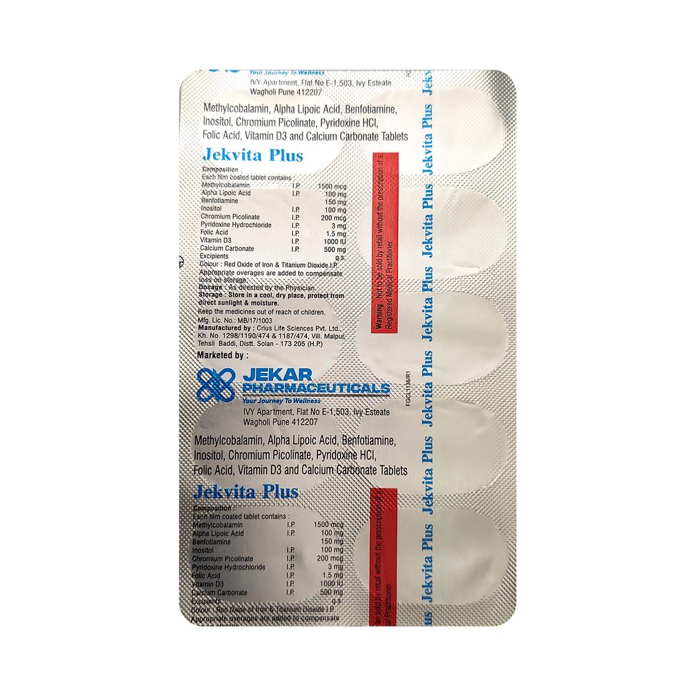 Jekvita Plus Tablet is a combination of nine medicines : Calcium Carbonate, Benfotiamine, Alpha Lipoic Acid, Inositol, Chromium Picolinate, Methylcobalamin, Folic Acid, Pyridoxine Hydrochloride, and Vitamin D3. Calcium carbonate is a dietary supplement used when the amount of calcium taken in the diet is not enough. Chromium Picolinate and Benfotiamine are nutritional supplements that provide essential nutrients to our body and improve overall health. Alpha lipoic acid acts as a potent antioxidant (substance that protects against cell damage) by neutralizing the free radicals (waste products formed in the body during energy production) such as reactive oxygen and nitrogen species. Further, it initiates natural antioxidant processes in the body. It also maintains the levels of Vitamin E and Vitamin C in the body. Inositol works by relaxing the blood vessels and improving blood flow to the legs, toes and fingers, thereby relieving pain. Methylcobalamin is a form of vitamin B12 that restores its level in the body thereby helping in treating certain anemias and nerve problems. Folic Acid is a form of vitamin B. It plays a vital role in the formation of red blood cells, which carry oxygen throughout the body. It is also essential in pregnancy due to its role in the development of the unborn baby's brain and spinal cord. Pyridoxine Hydrochloride, a supplement of vitamin B6, is required by your body for utilization of energy in the foods you eat, production of red blood cells, and proper functioning of nerves. Vitamin D3 is a form of vitamin D. It raises vitamin D levels in your blood. This in turn raises calcium levels in your blood by helping you absorb more calcium from food.