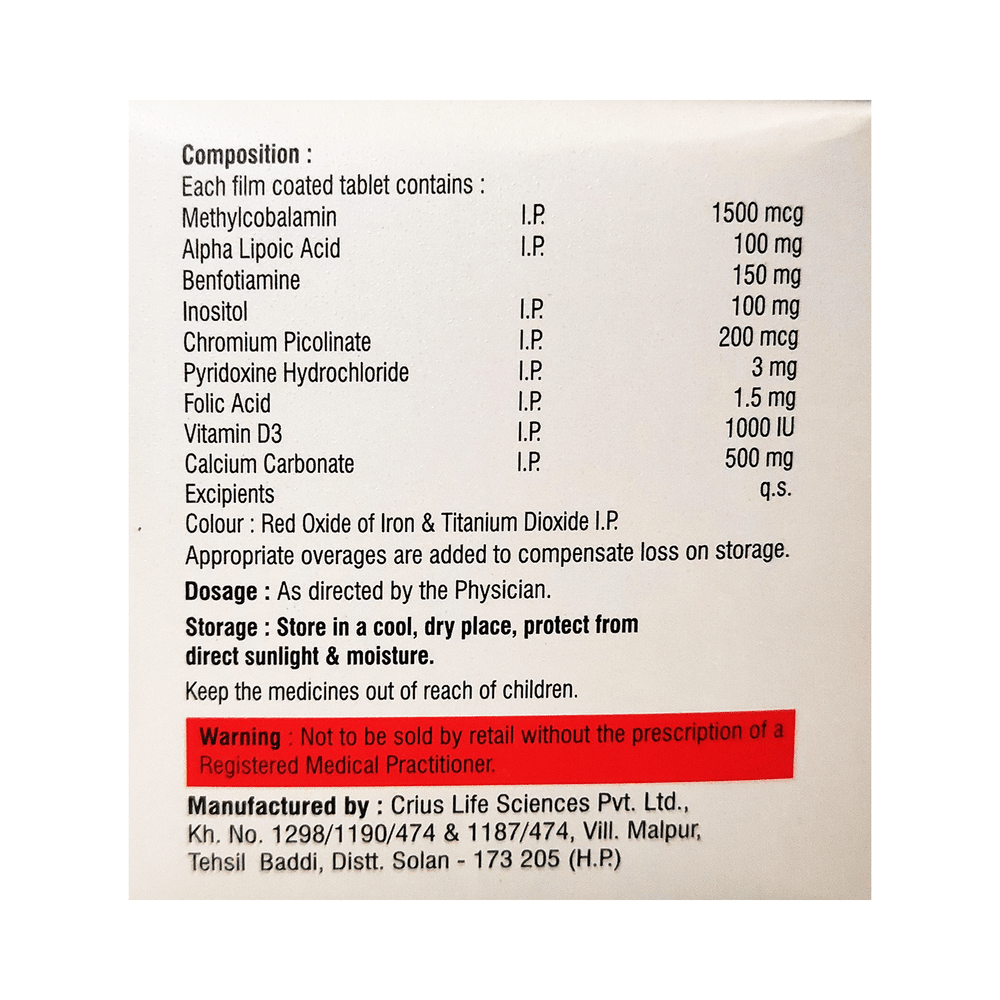 Salt Composition: Calcium Carbonate (500mg) + Benfotiamine (150mg) + Alpha Lipoic Acid (100mg) + Inositol (100mg) + Chromium Picolinate (200mcg) + Methylcobalamin (1500mcg) + Folic Acid (1.5mg) + Pyridoxine Hydrochloride (3mg) + Vitamin D3 (1000IU)