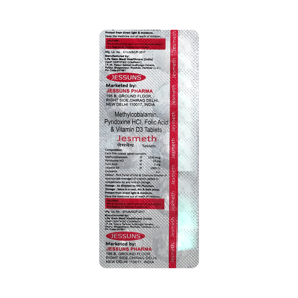 Jesmeth Tablet is a combination of three nutritional supplements: Methylcobalamin, Vitamin B6 (Pyridoxine), and Folic Acid. They replenish the body's stores of important nutrients.