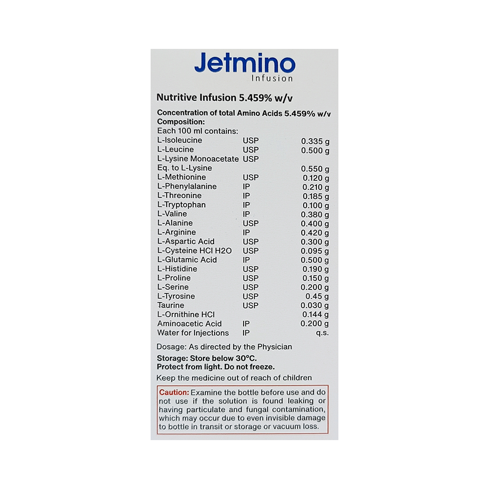 Jetmino Infusion are organic compounds that are chained together to form proteins. It is used to treat nutritional deficiencies. It promotes nitrogen-balancing in the body, also replenishes the protein reserve of the body in extensive burns or protein-calorie malnutrition. Jetmino Infusion is given under the supervision of a healthcare professional. Take it in a dose and duration as advised by the doctor. The full course of treatment should be completed as per prescription.This medicine may cause injection site inflammation (redness, swelling, and pain), acute folic acid deficiency, fever, and increased sweating as its side effects. It is better to consult with your doctor if any of the side effects bother you.This medicine may also cause metabolic and liver disorders, that is why it is important to undergo regular clinical evaluations and laboratory tests (blood and urine) to know the effects and side effects of this medicine on your organs. Before initiating this treatment, you must consult your doctor if you have any health conditions or your ongoing medications. Pregnant and breastfeeding women should only take this medicine if advised by the doctor.