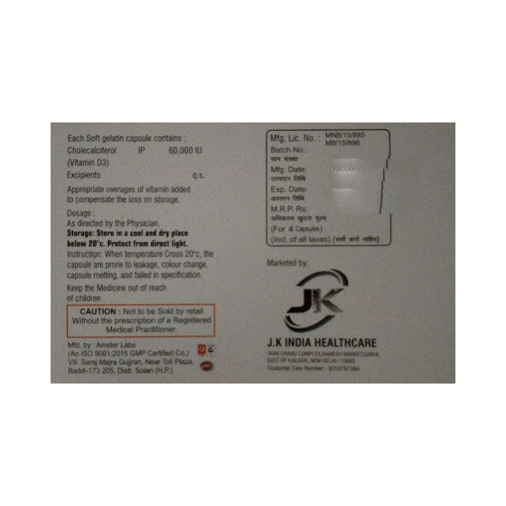 JK-D3 60K Capsule is used in the treatment of vitamin D deficiency and osteoporosis. It helps the body to absorb calcium. Calcium is essential for maintaining strong and healthy bones. It is used when your diet does not provide enough calcium. JK-D3 60K Capsule should be taken as directed by your doctor. It is best taken with or after food, as this helps your body absorb it, and you should take it regularly to get the most benefits. If you are using it to treat osteoporosis, you will also be prescribed other medicines. This medicine may be only part of a complete treatment program that includes making changes to your diet and taking calcium and vitamin supplements. Learn about the foods you should eat to ensure you get enough calcium and vitamin D.JK-D3 60K Capsule has few side effects, and none are common. If you take too much, you may feel weakness, muscle pain, or a metallic taste in your mouth. If you experience any such side effects, speak with your doctor. They may be able to help you reduce or treat the symptoms.Before taking this medicine, tell your doctor if you have high calcium levels in your blood or if you have any heart, kidney, or liver disease. Some other medicines can decrease the absorption of vitamin D3, so let your doctor know about all the other medicines you are taking to make sure you are safe. This medicine may help during pregnancy when your body needs more vitamin D, but too much could harm your baby. Discuss it with your doctor.