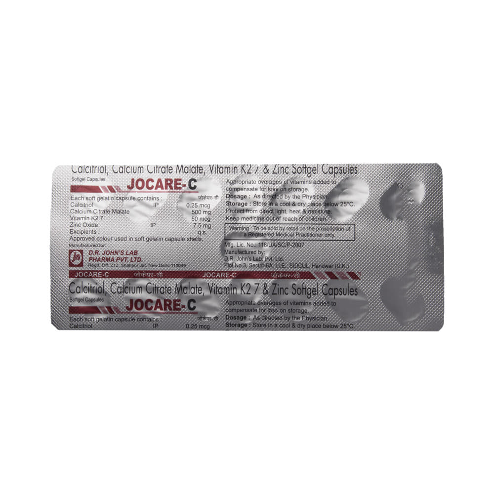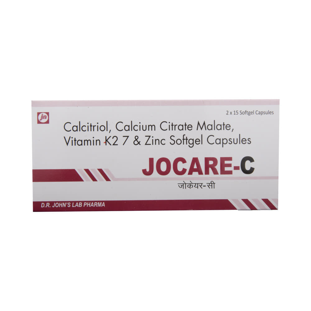 Jocare-C Soft Gelatin Capsule is a combination of four medicines : Calcitriol, Calcium Citrate Malate, Vitamin K2-7, and Zinc Oxide. Calcitriol is the active form of Vitamin D. It raises Vitamin D levels in your blood. This in turn raises calcium levels in your blood by helping you absorb more calcium from your intestine. Calcium citrate malate is a water-soluble calcium supplement. It increases the plasma calcium levels. Vitamin K2-7 plays a central role in the metabolism of calcium, the main mineral found in your bones and teeth. Vitamin K2-7 activates the calcium-binding actions of two proteins : matrix GLA protein and osteocalcin, which help to build and maintain bone health. Zinc oxide is a necessary trace element in the diet, forming an essential part of many enzymes, and playing an important role in protein synthesis and in cell division.