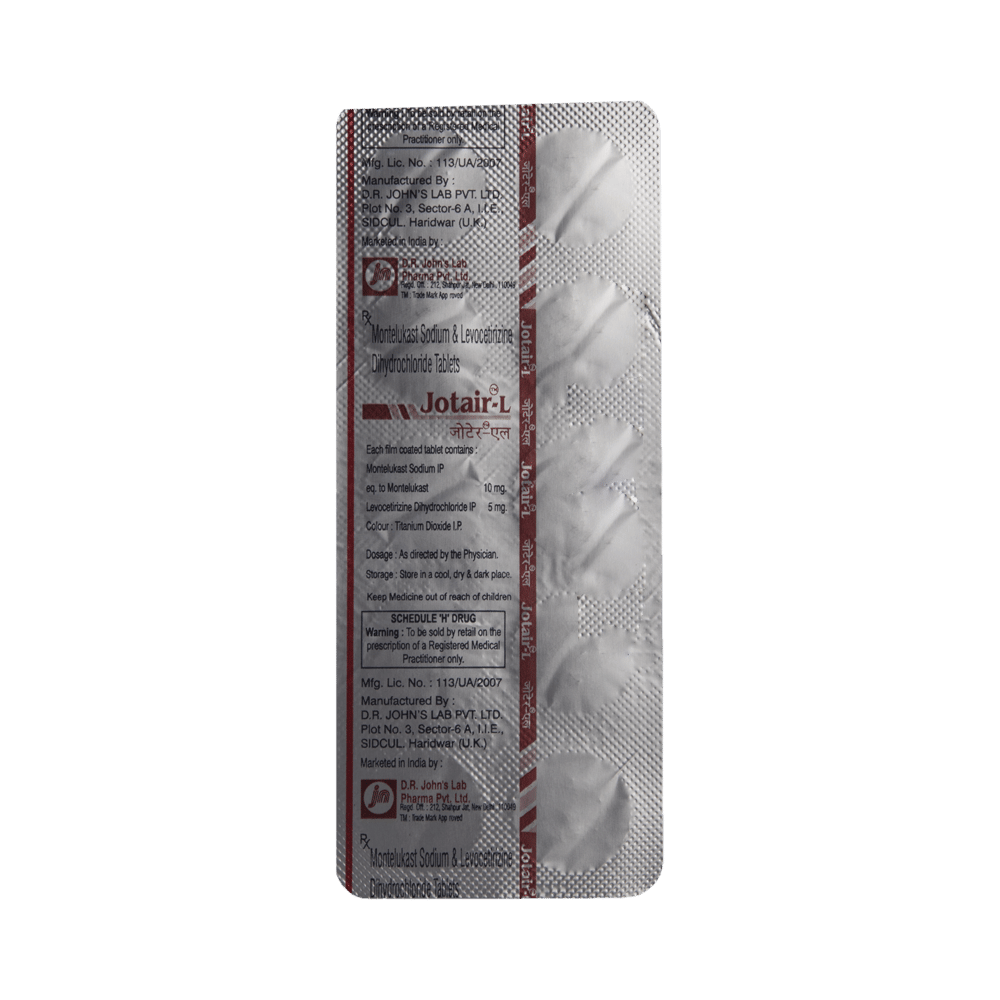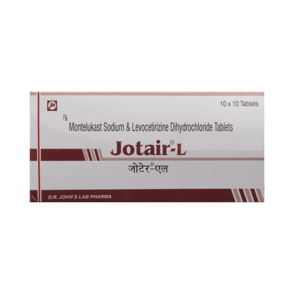 In Treatment of Allergic skin conditionsJotair L Tablet is effective in treating allergic skin conditions with inflammation and itching. It reduces the actions of chemicals in the body that cause inflammation of the skin. When used correctly it is a safe and effective treatment. It reduces the redness, rash, pain or itchiness caused by your skin’s reaction to an irritant. It thus improves your self-esteem and confidence as your appearance changes. Keep taking it for as long as it is prescribed to get the full benefits.In Treatment of Sneezing and runny nose due to allergiesJotair L Tablet is a combination medicine that provides relief from symptoms such as blocked or runny nose, sneezing and itchy or watery eyes. This will make it easier for you to go about your daily activities. It rarely has any serious side effects and you may only need to take it on days you have symptoms. If you are taking it to prevent getting symptoms you should use it regularly to get the most benefit.In Treatment of Hay feverHay fever, also called allergic rhinitis, causes cold-like signs and symptoms, such as a runny nose, itchy eyes, congestion, sneezing and sinus pressure. The only difference is that in hay fever, these symptoms are not produced due to a virus but are simply allergic responses of our body to allergens (allergy causing agents such as pollen). Jotair L Tablet is used to provide relief from these symptoms of hay fever. It works by blocking the release of the chemical substance responsible for producing such allergy symptoms. Jotair L Tablet is a safe medicine which helps treat hay fever and makes us feel at ease.show moreshow less