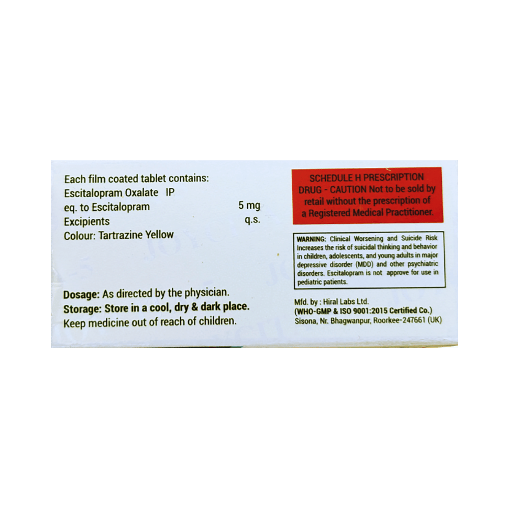 Joycita 5 Tablet is widely prescribed to treat depression and other mental health conditions like anxiety, panic disorder, and obsessive-compulsive disorder. It is a type of antidepressant known as a selective serotonin reuptake inhibitor (SSRI). Joycita 5 Tablet helps recover from depression by improving mood and relieving anxiety and tension. It can be taken with or without food. The dose and how often you need it will be decided by your doctor based on the amount needed to control your symptoms. Your doctor may start you on a lower dose and increase it gradually. Do not change the dose or stop taking it without talking to your doctor, even if you feel well. Doing so may make your condition worse or you may suffer from unpleasant withdrawal symptoms such as anxiety, restlessness, palpitations, dizziness, sleep disturbances.To get the most benefit, take this medicine regularly at the same time each day. Your doctor may advise you to take it in the morning if you have trouble sleeping. It may take a few weeks before you start feeling better. Let your doctor know if you do not see any improvement even after 4 weeks.Some common side effects of this medicine include nausea, fatigue, increased sweating, insomnia (difficulty in sleeping), decreased sexual drive, delayed ejaculation, and women may experience difficulties achieving orgasm. Some people may experience sleepiness after taking this medicine. Let your doctor know straight away if you develop any sudden worsening of mood or any thoughts about harming yourself.Before taking Joycita 5 Tablet, you should tell your doctor if you have epilepsy (seizure disorder or fits), diabetes, liver or kidney disease, any heart problems, or are currently taking medicines for depression known as MAO inhibitors. These may affect your treatment. Please tell your doctor about all the medicines you are taking to make sure you are safe.
