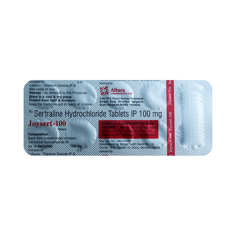 Joysert 100 Tablet is a medicine that is used to treat major depressive disorder (MDD) and obsessive-compulsive disorder (OCD). It works by increasing the levels of serotonin, a natural chemical in the brain that plays an important role in mood, emotions, and behavior. Joysert 100 Tablet should be taken exactly as prescribed by your doctor. It can be taken with or without food, but it is best to take it at the same time each day to help you remember. Treatment for depression and OCD often takes several weeks before you start to feel the full benefit, so it is important to keep taking the medicine regularly and not stop suddenly, even if you feel better.Stopping the medicine too quickly may cause withdrawal symptoms or make your condition return. For the best results, combine the treatment with healthy habits such as regular sleep, exercise, and support from family, friends, or counseling if recommended.Some common side effects of Joysert 100 Tablet include nausea, indigestion, loss of appetite, increased sweating, tremors, insomnia (difficulty in sleeping), and diarrhea. Sexual side effects like decreased sexual drive, delayed ejaculation, and erectile dysfunction may also be seen. Let your doctor know straight away if you develop any sudden worsening of mood or any thoughts about harming yourself.Before taking this medicine, you should tell your doctor if you have epilepsy (seizure disorder or fits), diabetes, liver or kidney disease, heart problems, or glaucoma. These may affect your treatment. Pregnant or breastfeeding women should also consult their doctor before taking it. Some other medicines may affect the way it works, especially other antidepressants and medicines called MAO inhibitors. Inform your doctor about all the medicines you are taking to make sure you are safe.